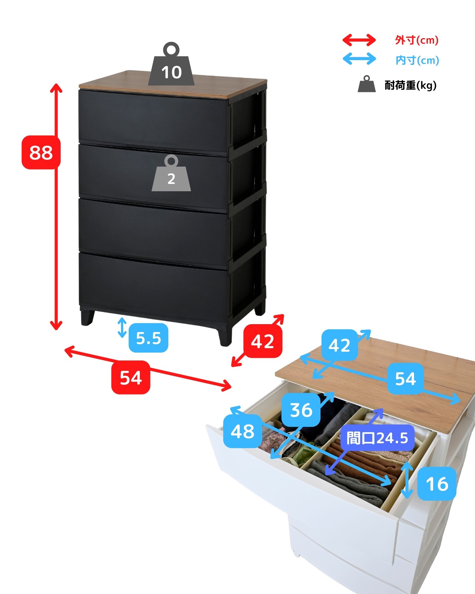 ●耐荷重: 天板 約10kg(均等に荷重をかけた場合)、引出し1段あたり 約2kg
