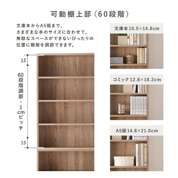 60cm幅:可動棚上部 60段階調節(1cmピッチ)/可動棚3枚、可動棚下部 40段階調節(1cmピッチ)/可動棚2枚