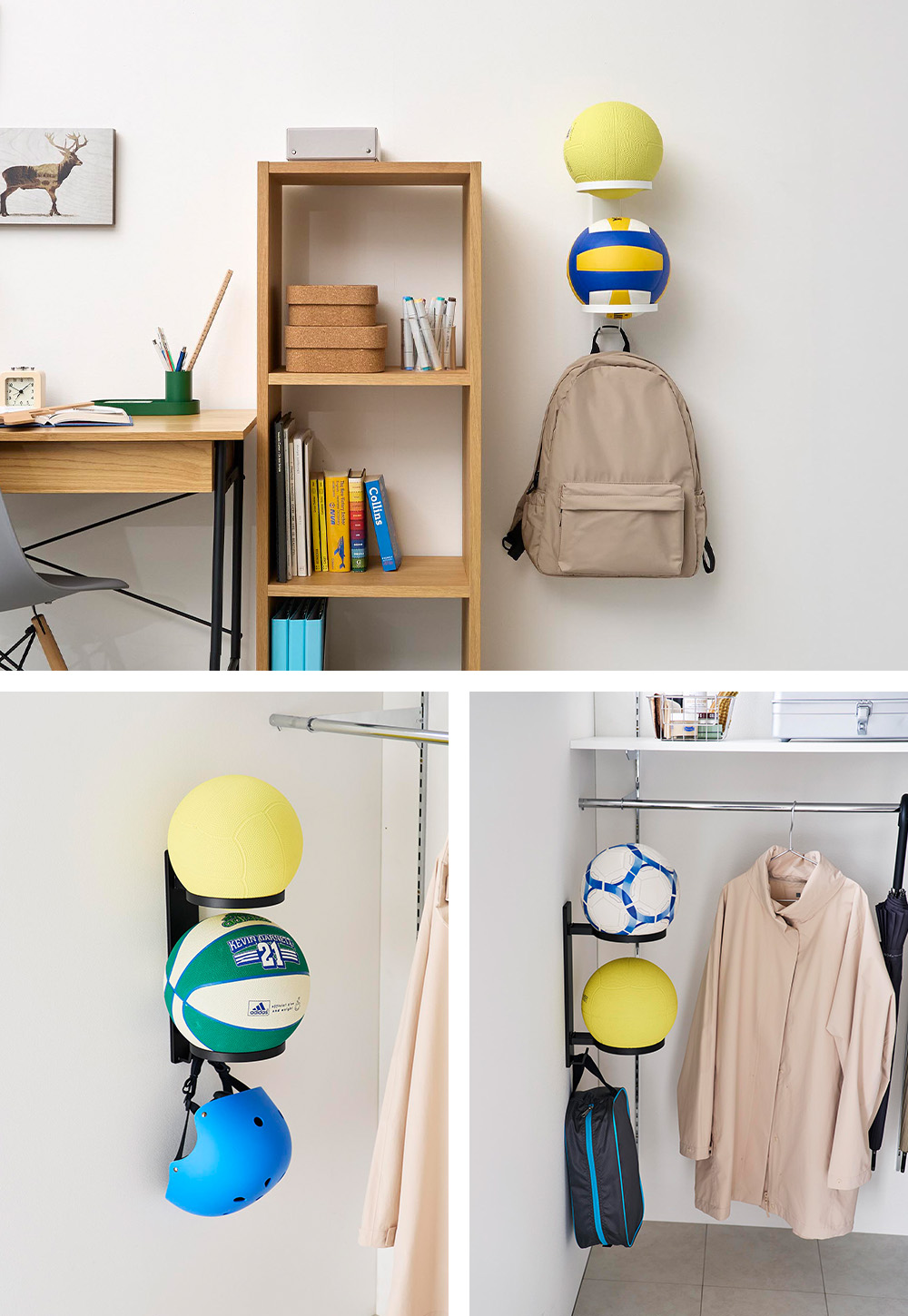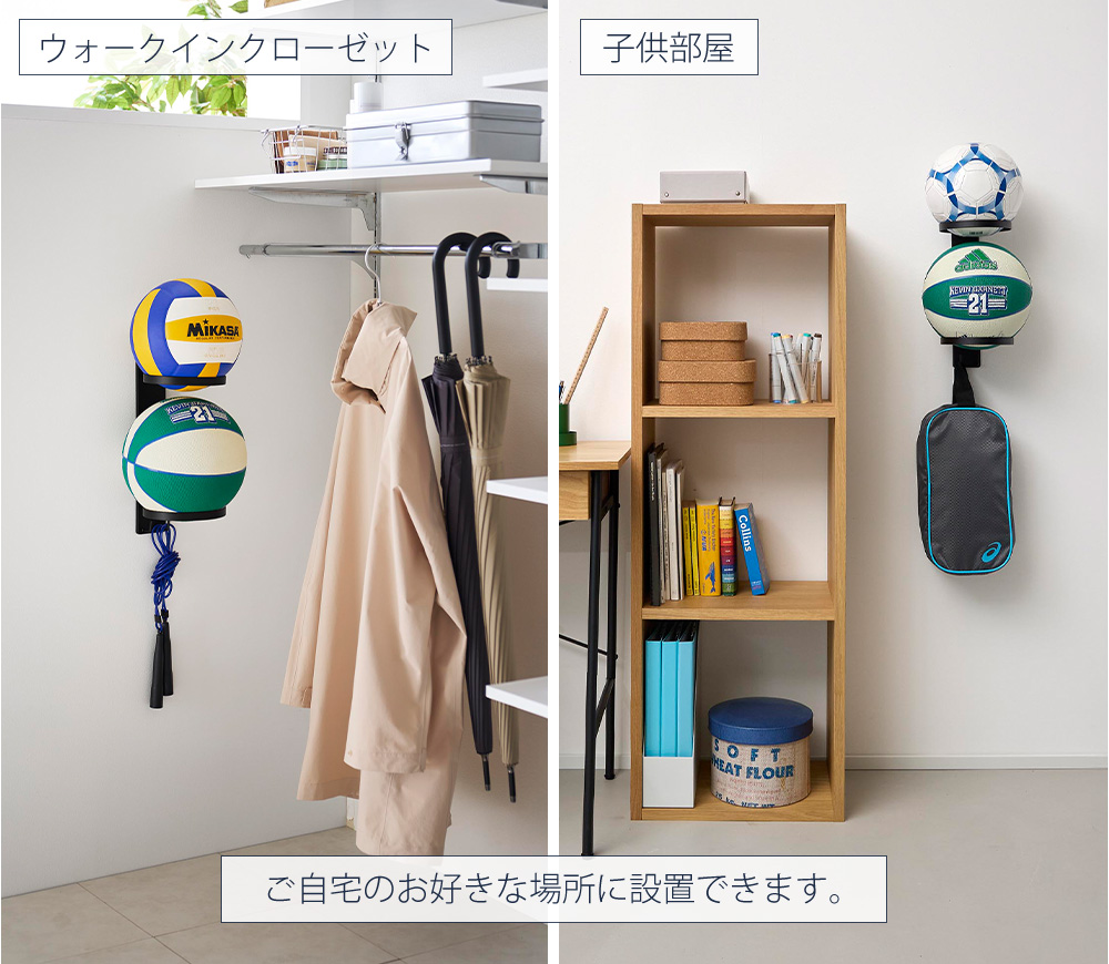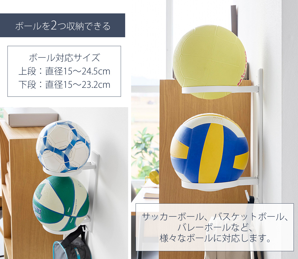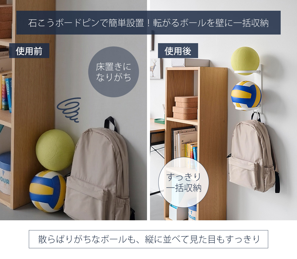 付属の石こうボードピンで簡単に設置できるボール収納ラック。床に置きっぱなしにならず、縦に並べることができるので、見た目もすっきり収納できます。
