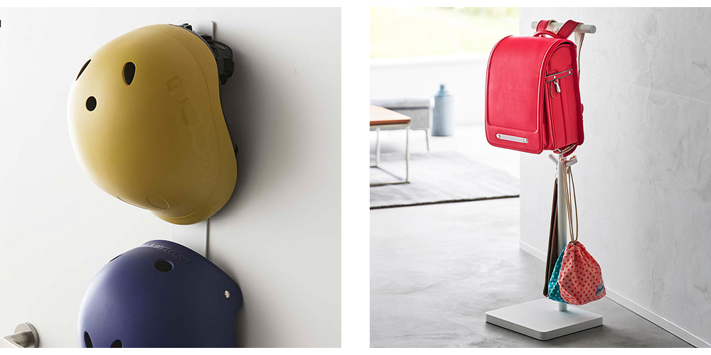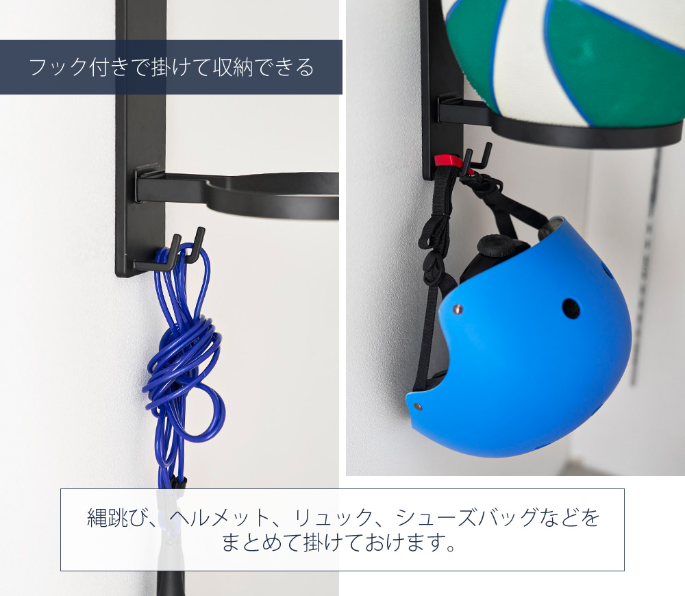 ボールリングの下のフックには縄跳び、ヘルメット、リュック、シューズバッグなど、掛けて収納したい物も一括収納できます。