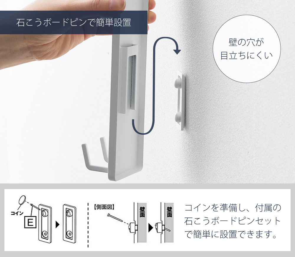 付属の石こうボードピンまたは木ネジで簡単に取り付け可能。石こうボードピンは、壁の穴が小さく目立ちにくいので、賃貸でも使いやすい仕様です。