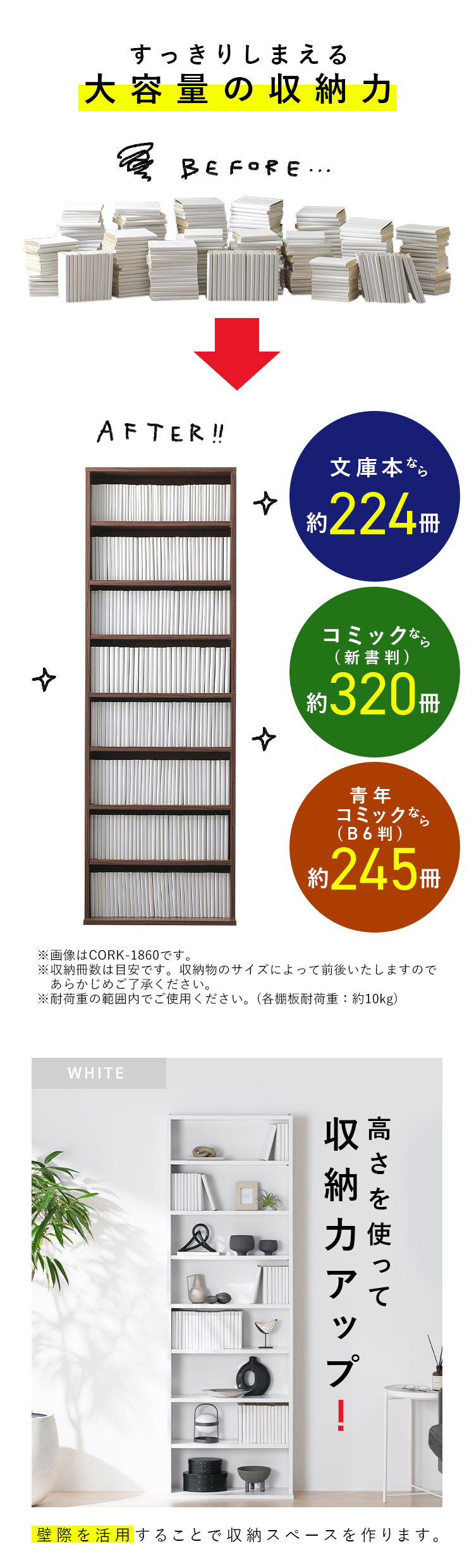 可動棚付きだから、文庫本から青年コミック(B6判)まで、サイズに合わせてすっきり収納できます。