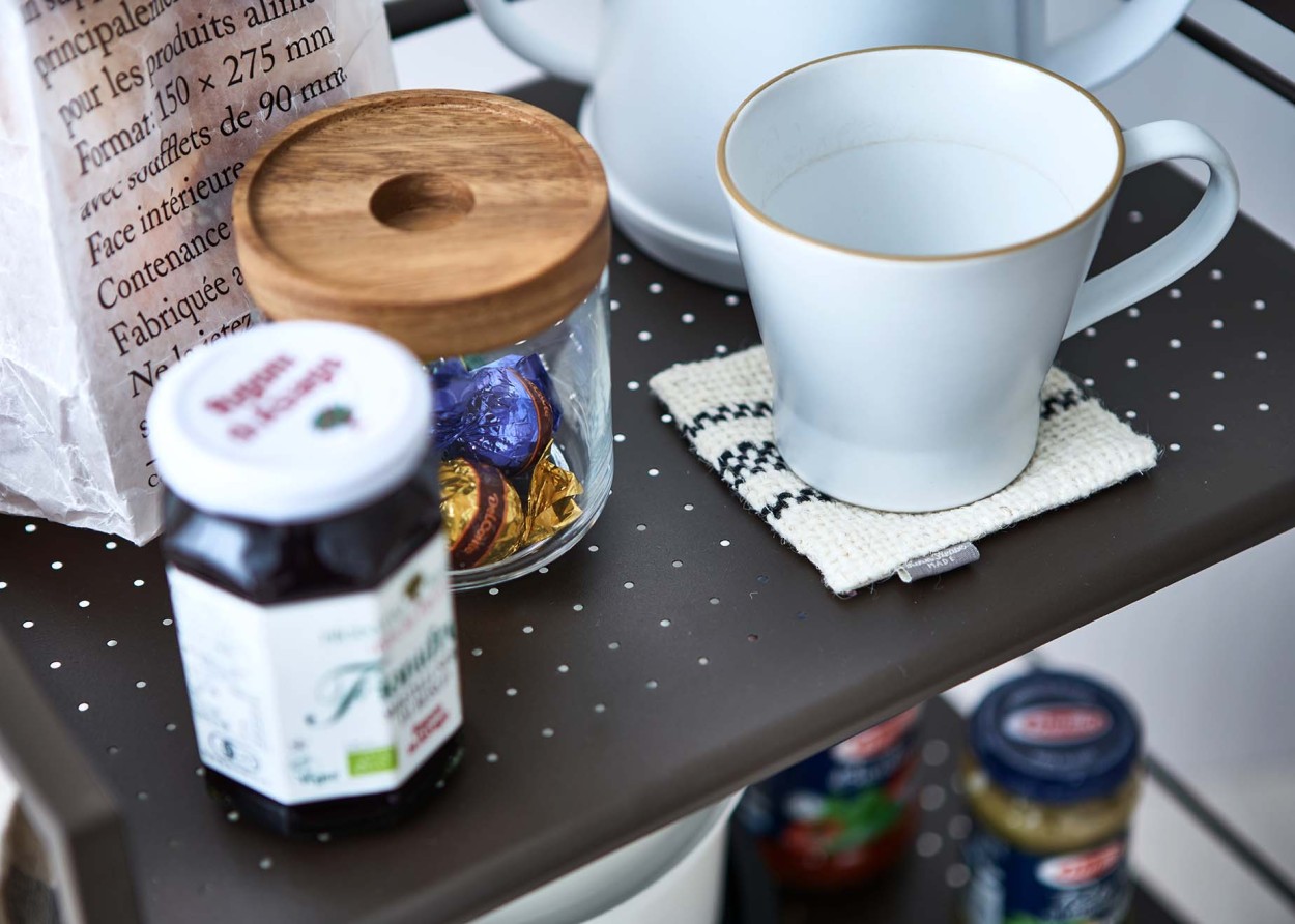 デスク周りの書類の整理や飲み物などのちょっとした小物置きに。