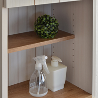 扉内は移動棚が2枚。8段階の設定が出来る為、洗剤や入浴剤な ど入れる物の高さに合わせて調整可能。背の高いものから低いものまで収納できるのが嬉しい!