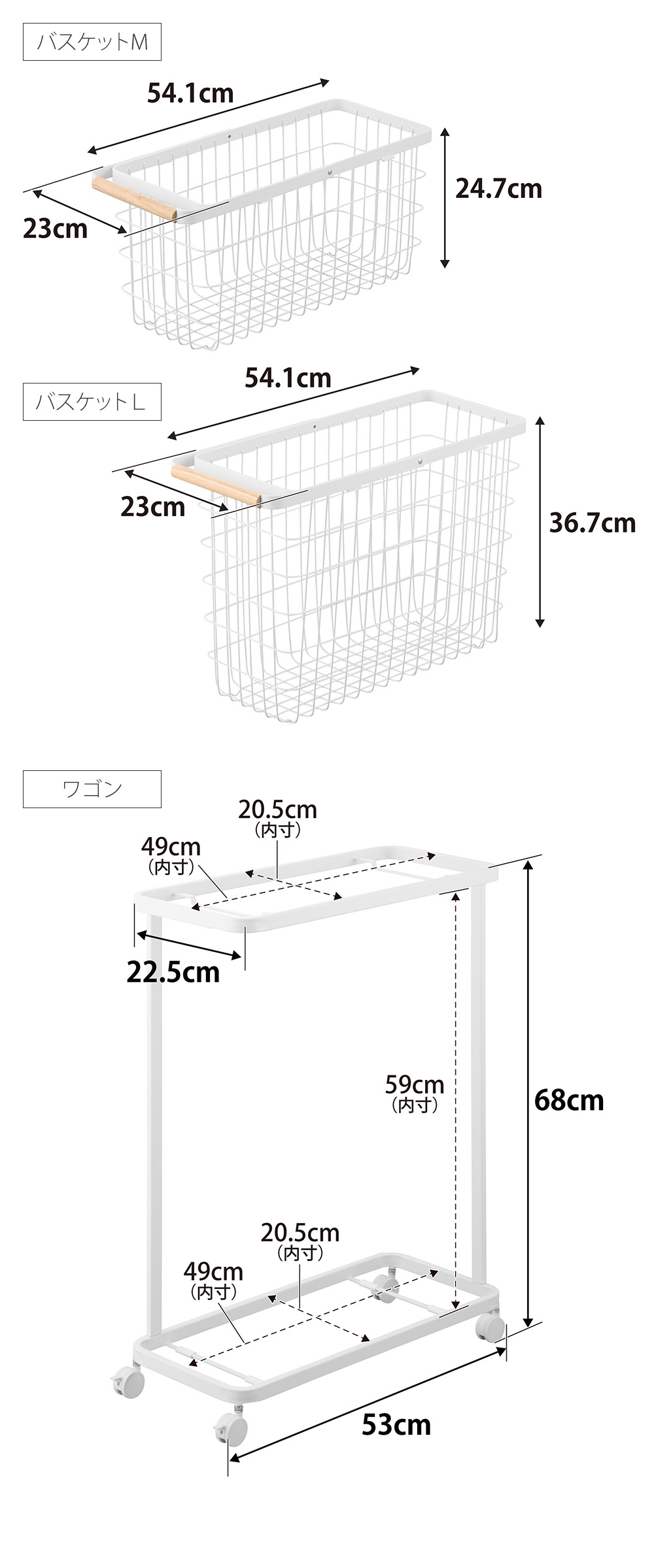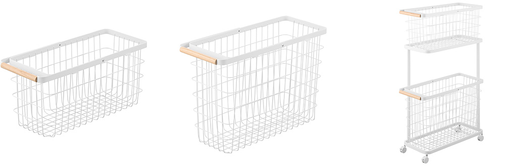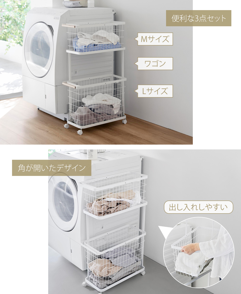 MサイズとLサイズのバスケットと専用ワゴンの3点セットです。専用ワゴンは バスケットの出し入れがしやすいコーナーが開いたデザインです。