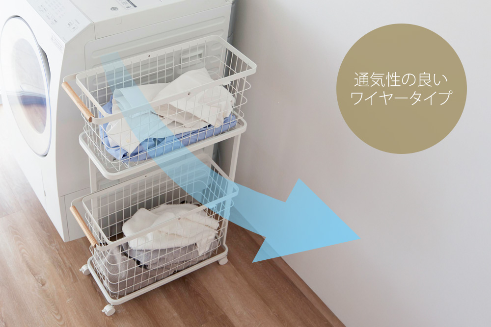 通気性の良いワイヤータイプのバスケットです。湿気やニオイがこもりにくく、洗濯物が蒸れにくくなっています。