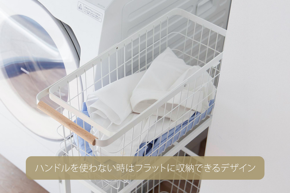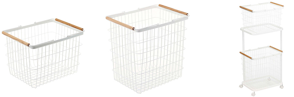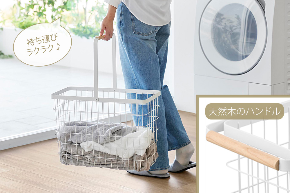 バスケットは持ち運びに便利なハンドル付きです。ハンドル部分は天然木になっておりデザイン上のアクセントになっています。