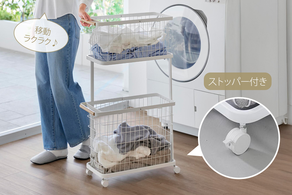 キャスター付きで洗濯物を入れたままワゴンの移動もカンタンです。4輪のうち2輪は動かしたくない時のためのストッパー付きです。