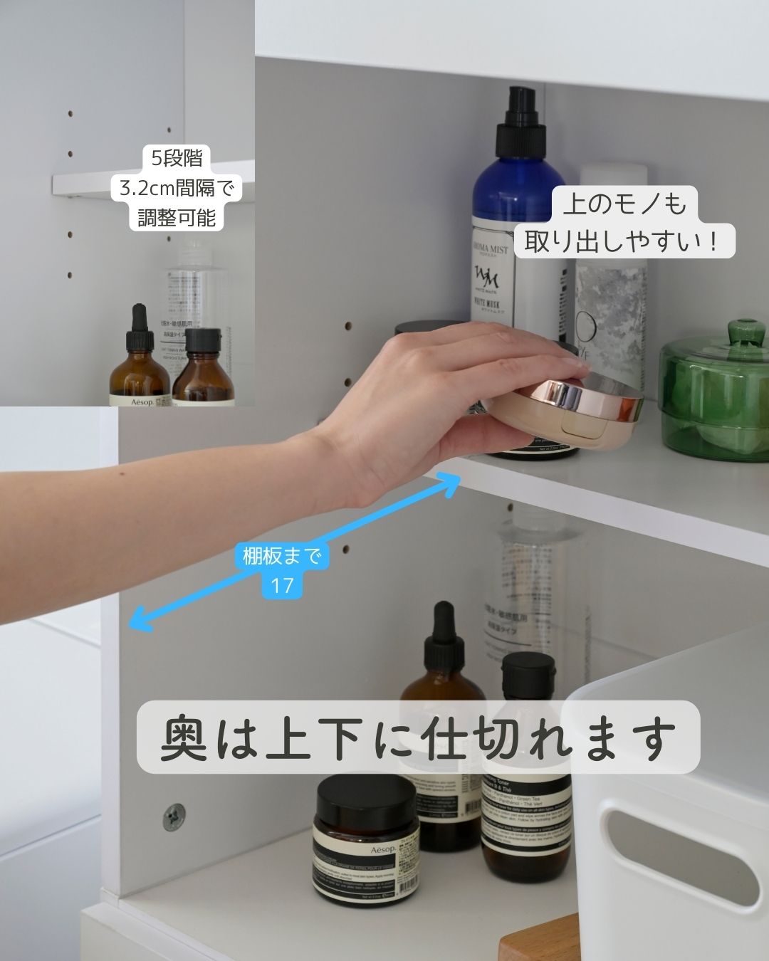 ●2枚の可動棚は3段階、3.2cm間隔での調整可能