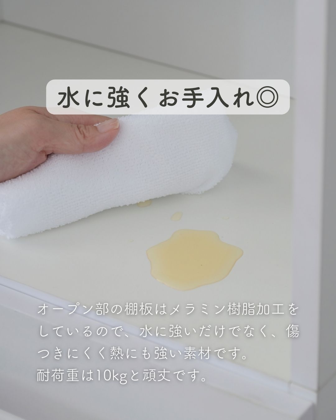 ●天板は水や傷に強いメラミン素材で、耐荷重10kg