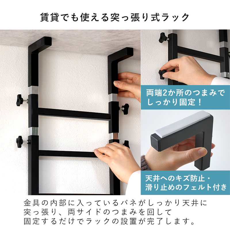 天井に突っ張るだけで使えるので、賃貸のお部屋の方も問題なくお使いいただけ、洗濯パンの上でも取り付けられる優れもの。