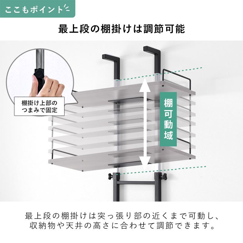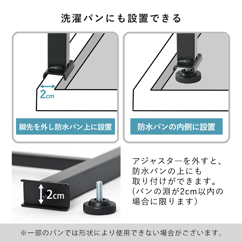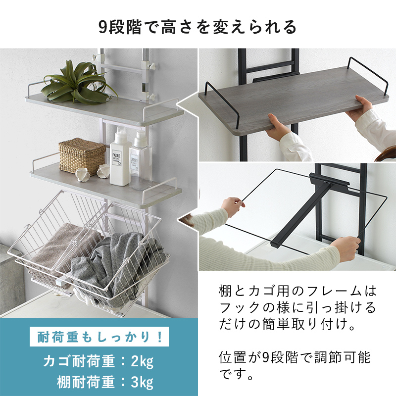 棚は簡単に着脱でき、使いやすい位置に取り付けることが可能なので、洗濯機の大きさを問わずお使いいただけます。