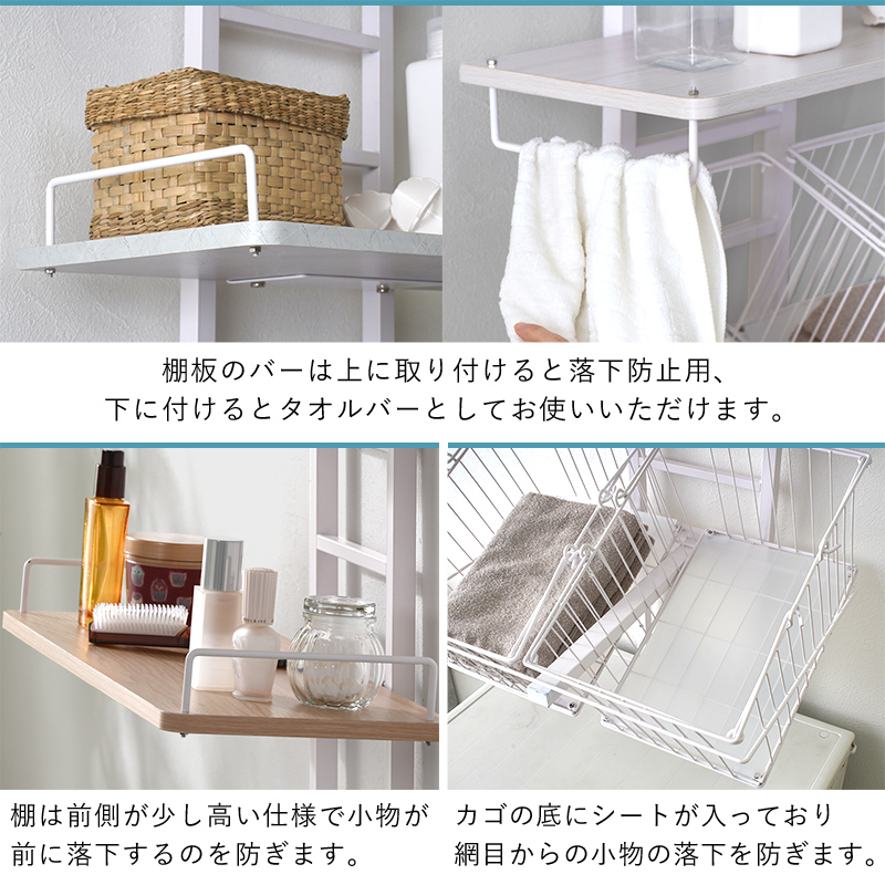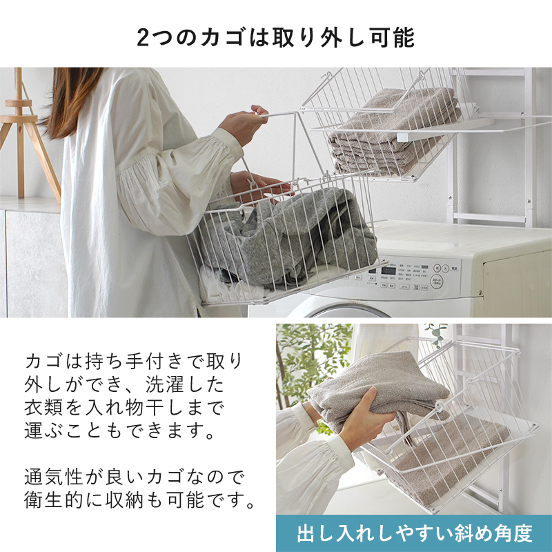 取り外し可能なカゴが2つ付属するので、洗濯したタオルなどを収納したり、汚れた服を入れて使えます。