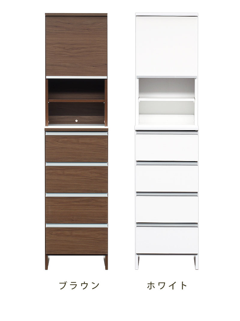 ハイタイプは扉付きの収納で隠してスッキリと。ロータイプ収納は圧迫感を感じさせず、4杯の引出しに整理して収納することができます。