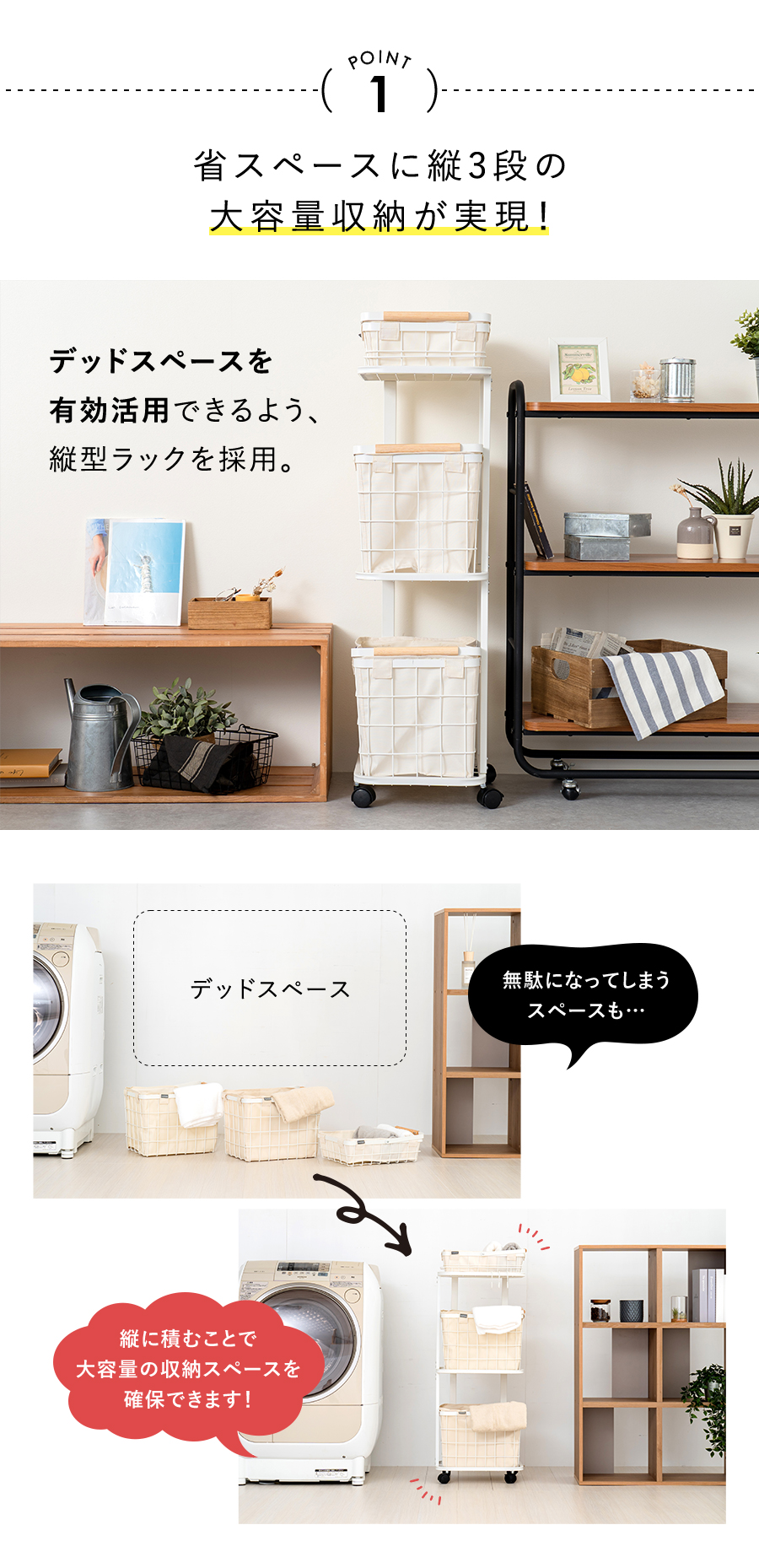 バスケットの寸法(約):外寸:(上段)374×272×106mm、(中段)374×272×267mm、(下段)374×272×267mm、内寸:(上段)360×260×105mm、(中段)360×260×255mm、(下段)360×260×255mm、容量:(上段)9L、(中段)23L、(下段)23L