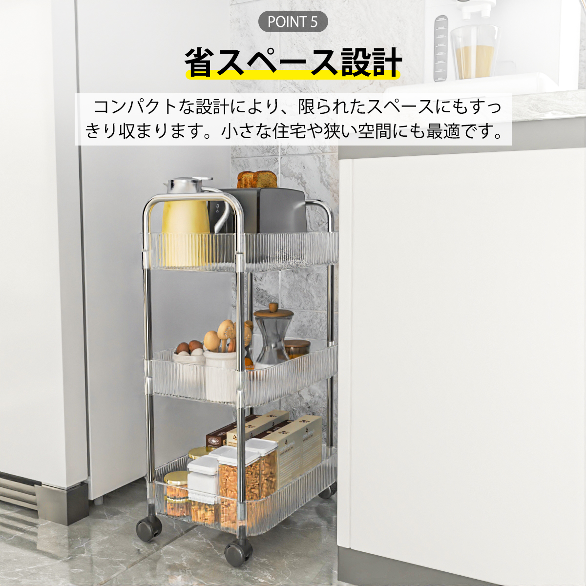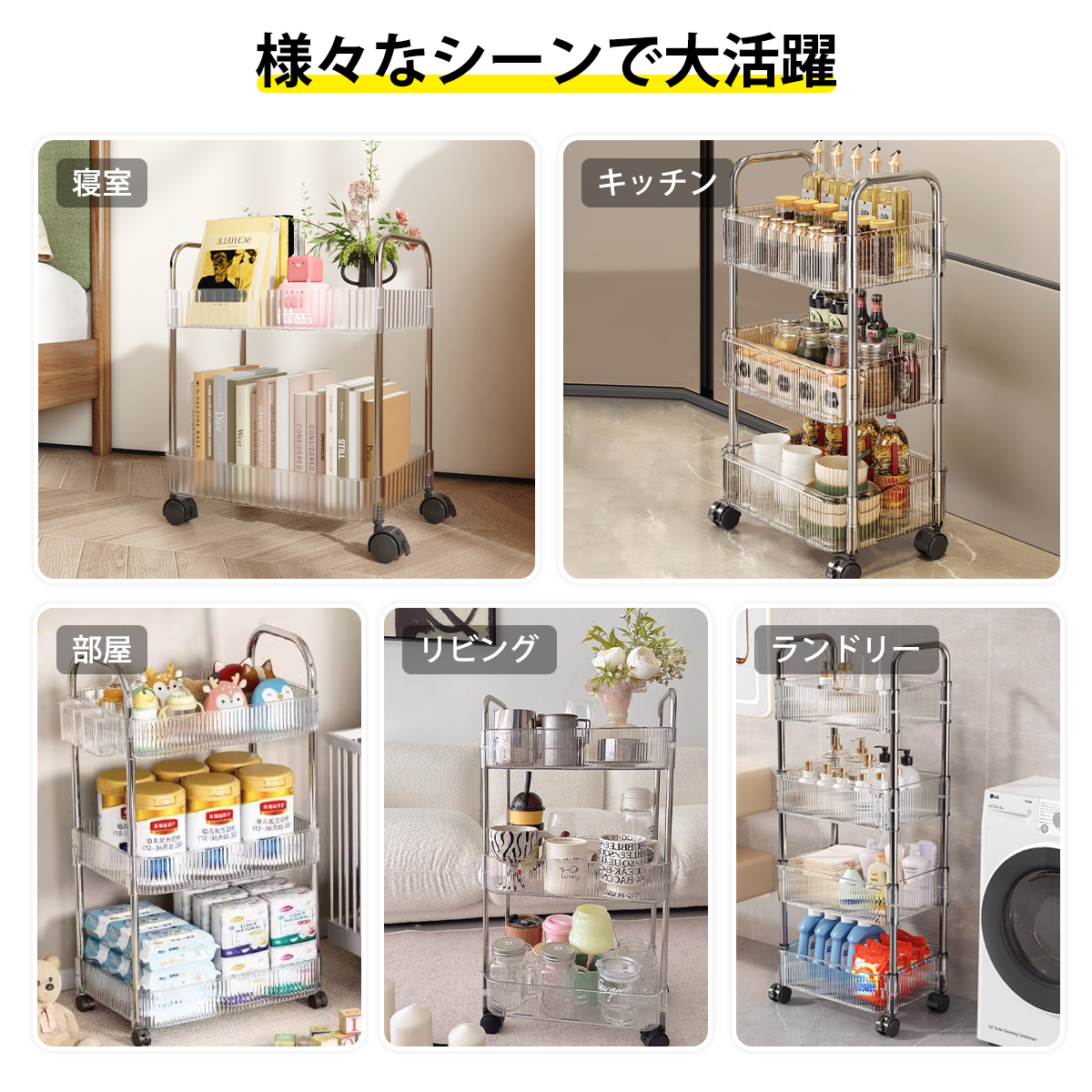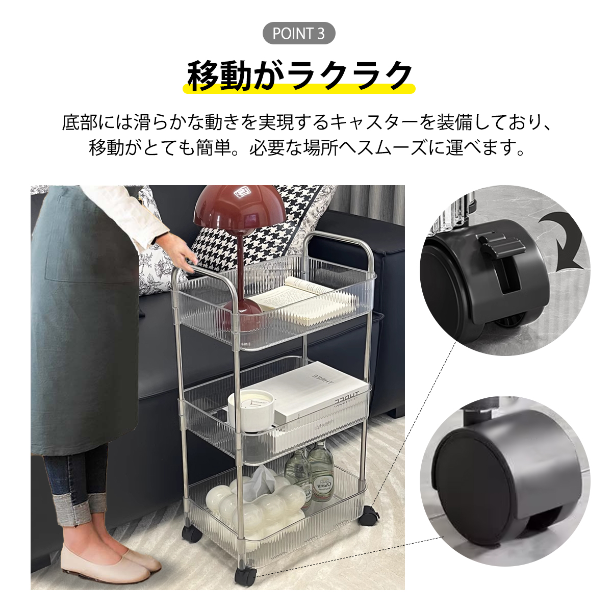 3. 透明な棚板で中身が見やすく、キャスター付きで移動もラクラク。