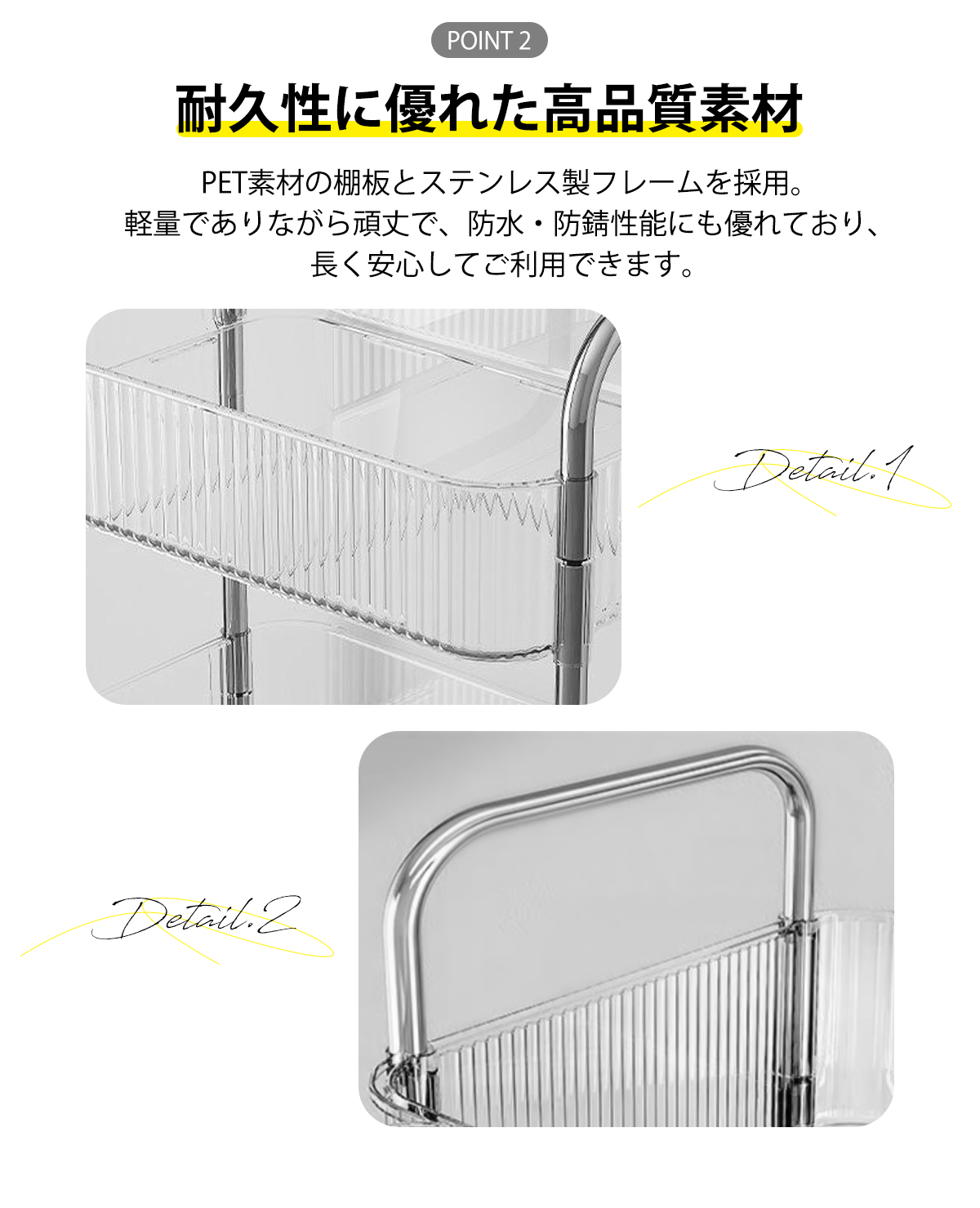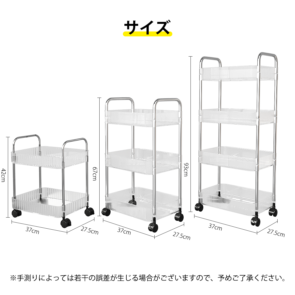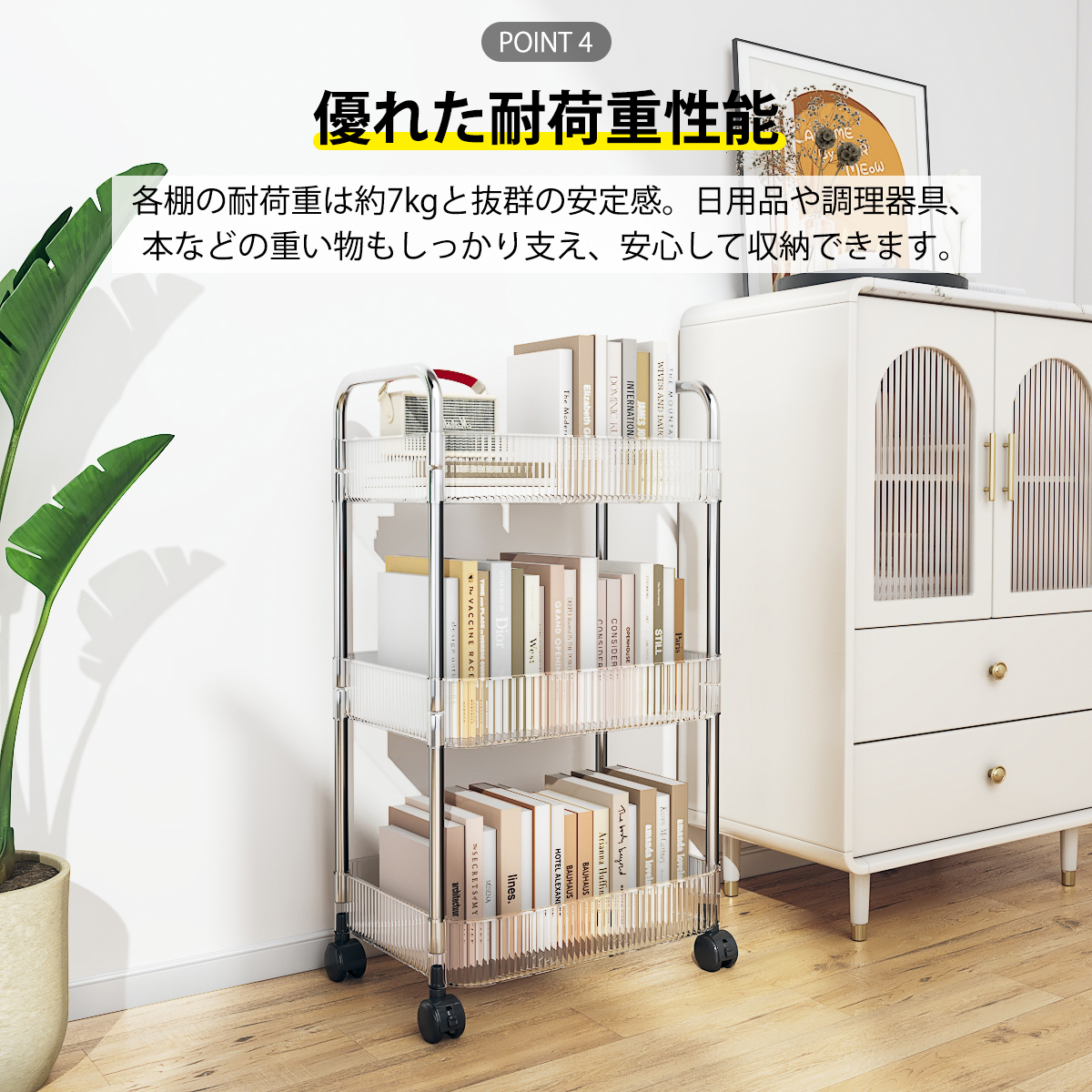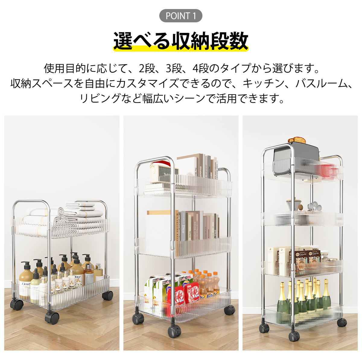 3. 透明な棚板で中身が見やすく、キャスター付きで移動もラクラク。