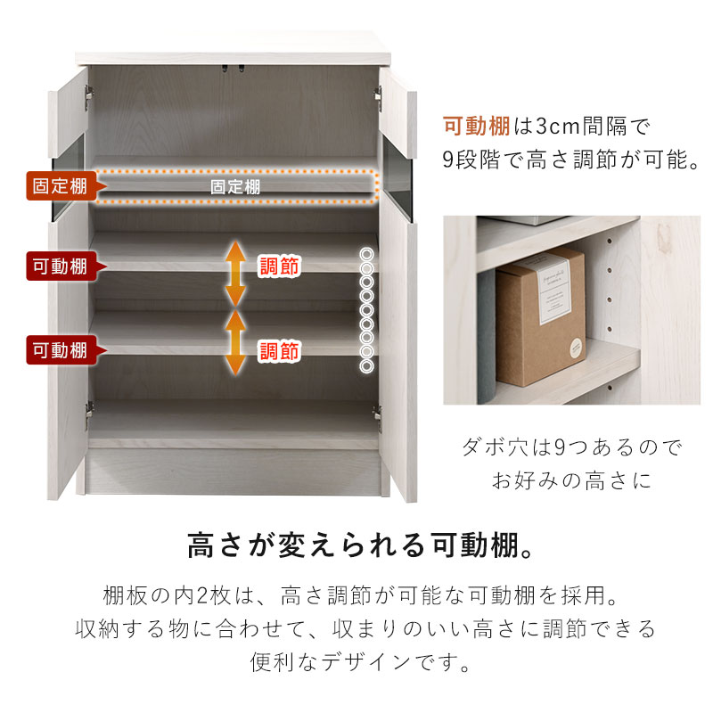デッドスペースだったカウンター下にぴったりな収納庫の登場です。高さは一般的なカウンター下のサイズに合わせて(約)85cmの高さに設計されています。このサイズは腰高窓と呼ばれる一般的な窓の高さと同じなので窓の下に置いて頂くにもぴったりなサイズとなっております。扉の中央にはガラス窓が装着されており中に何が入っているかひとめで解る便利な設計となっております。また下部の棚は可動棚となっておりますので収納したいものに応じて高さを変更して頂けます。