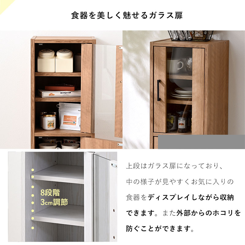 上段はガラス扉になっており、中の様子が見やすくお気に入りの食器をディスプレイしながら収納できます。また外部からのホコリを防ぐことができます。