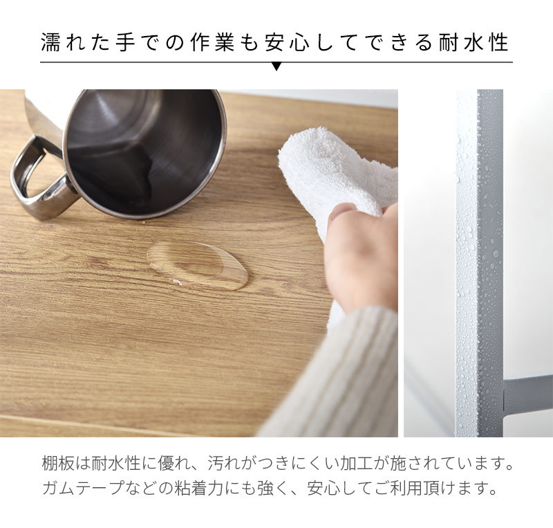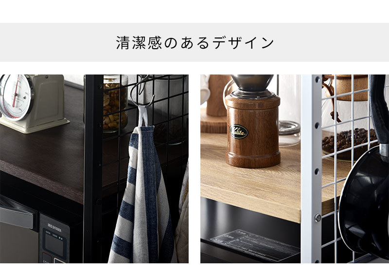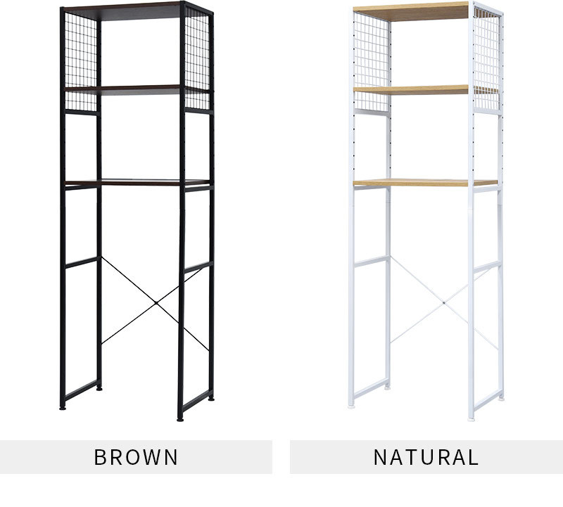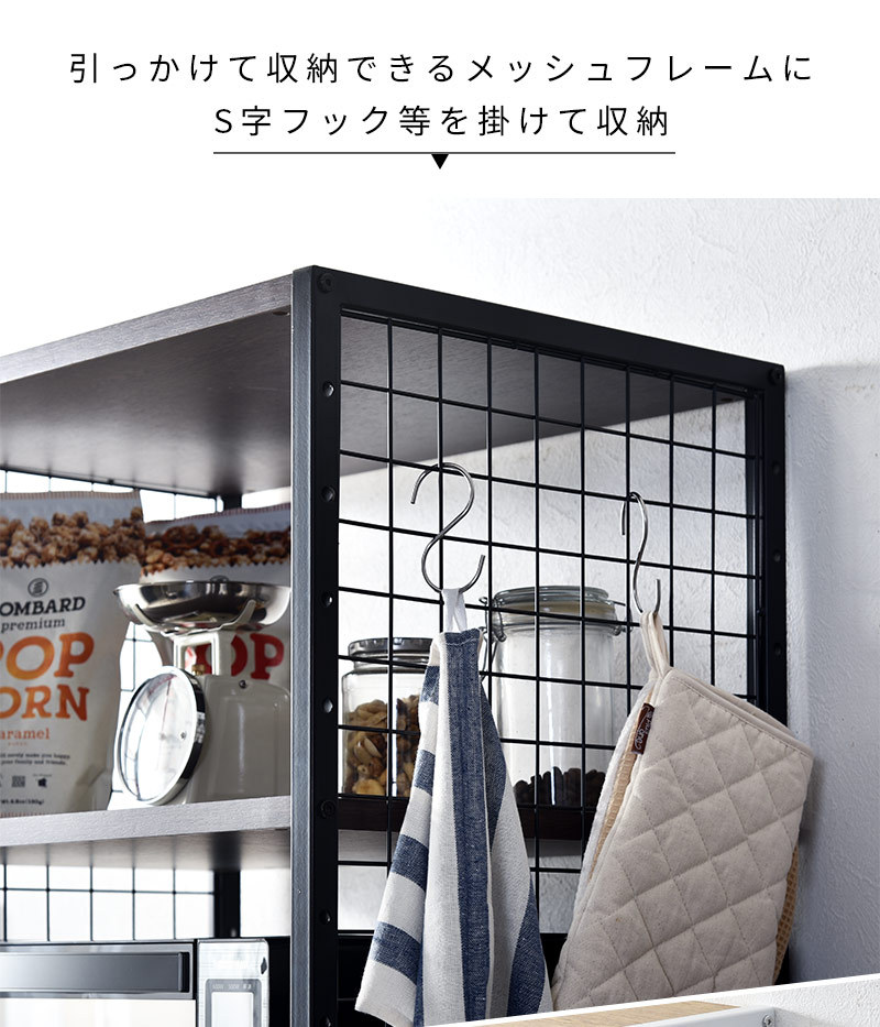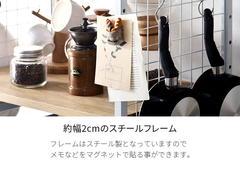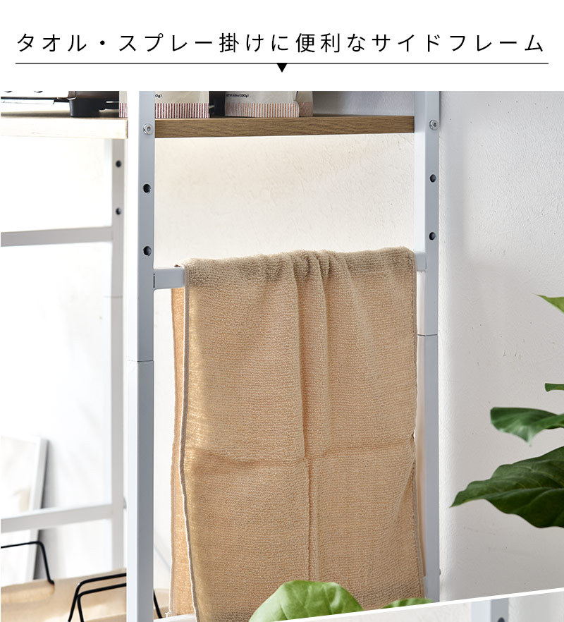 サイドには引っかけ収納やタオル掛けになるメッシュやフレームがあり、より高収納な仕上がりに。