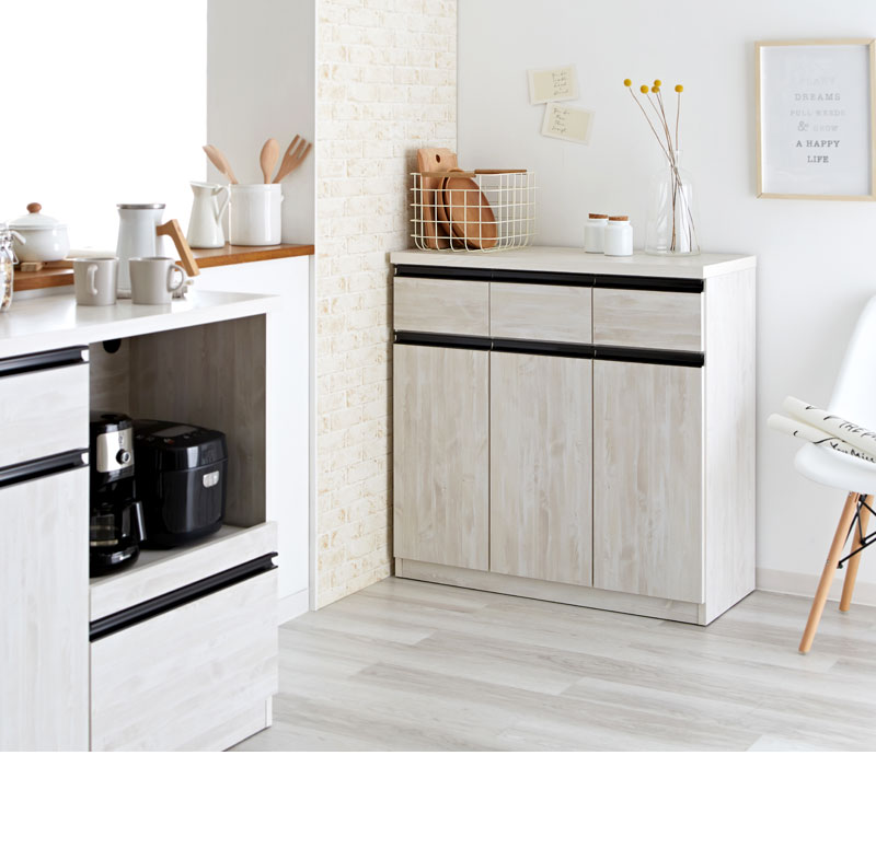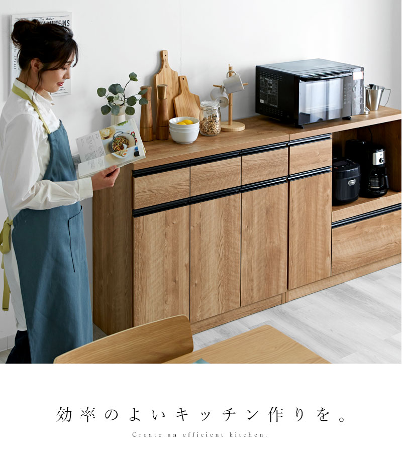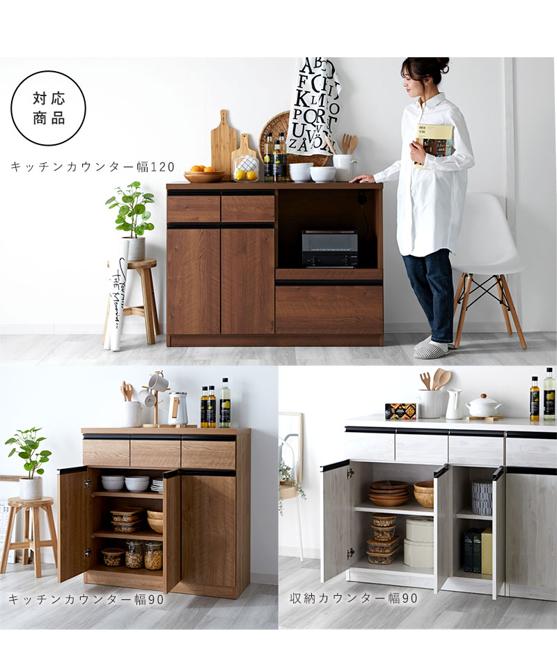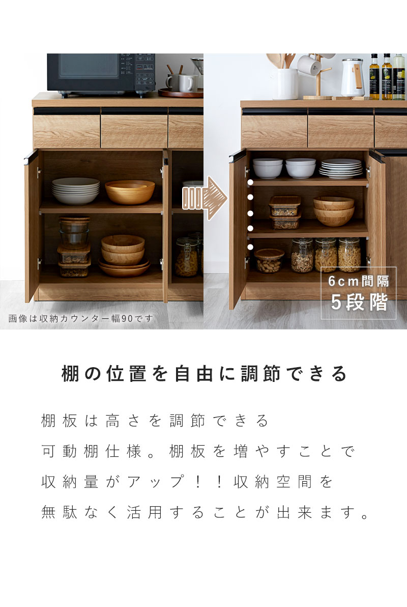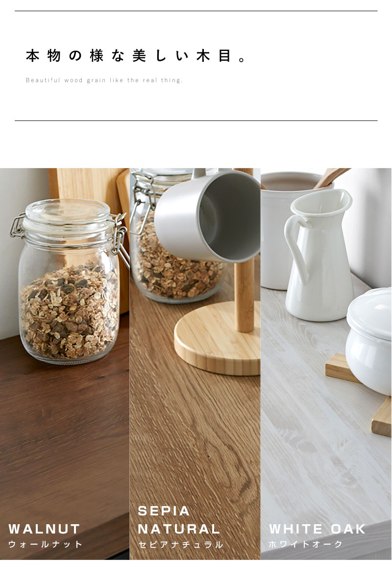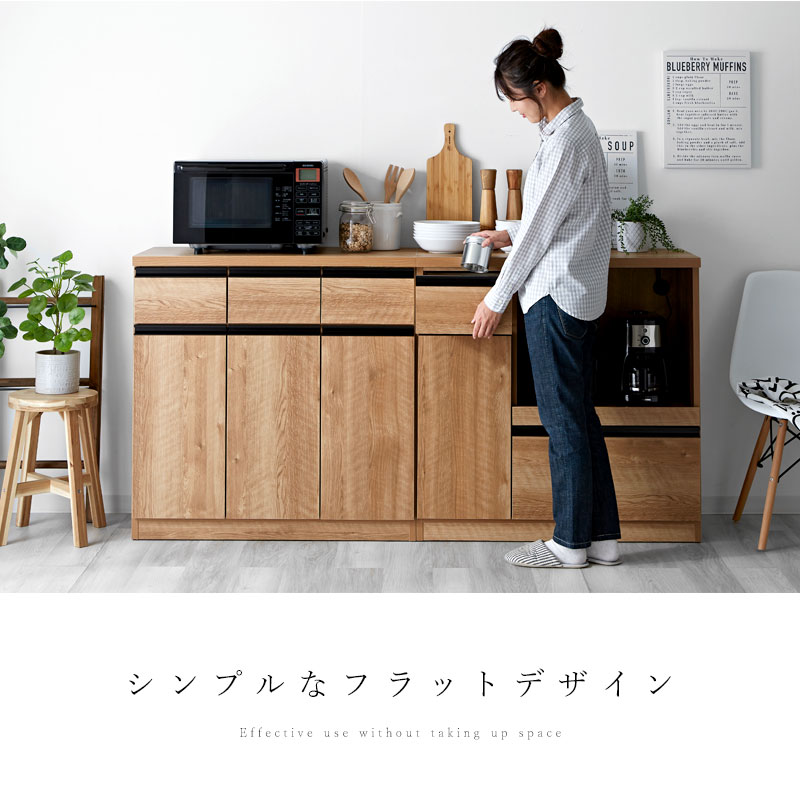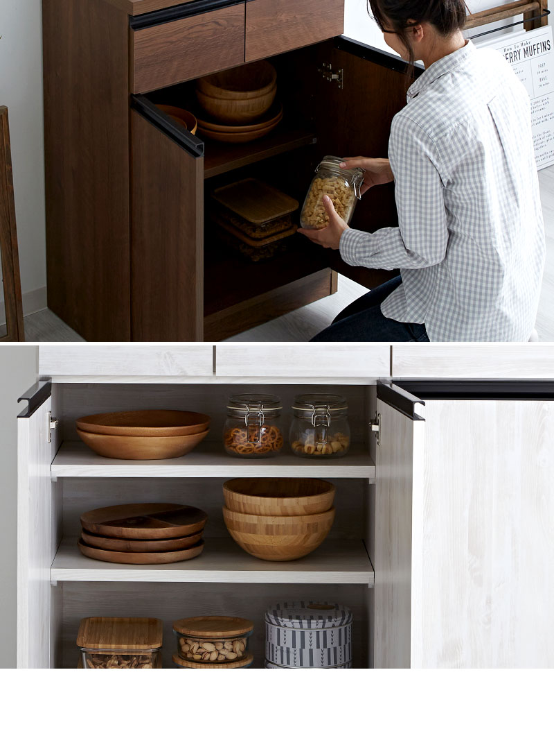 美しい木目模様のウッドとブラックの取っ手を組み合わせた雰囲気あるデザイン。北欧系やモダンなどどんなお部屋にも、清潔感のある空間を演出します。素敵になじむ人気の国産収納カウンター。