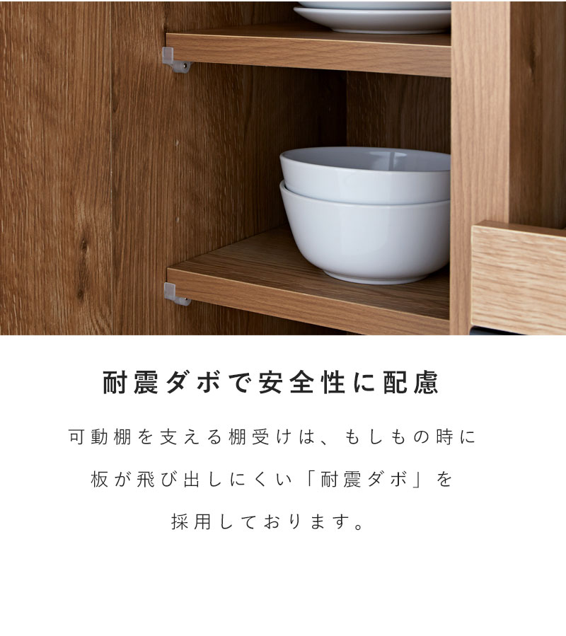 可動棚を支える棚受けは、もしもの時に板が飛び出しにくい「耐震ダボ」を採用しております。