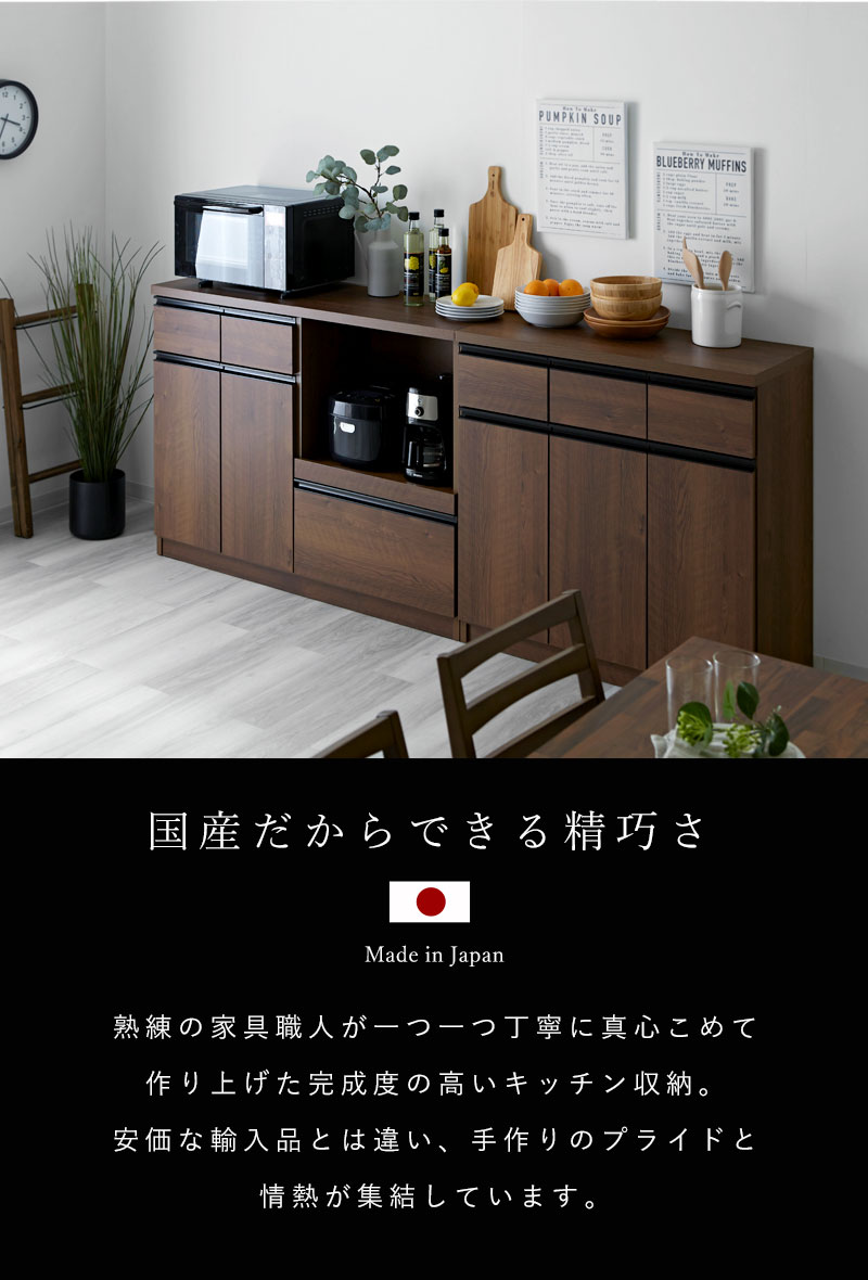 熟練の家具職人が一つ一つ丁寧に真心こめて作り上げた完成度の高いキッチン収納。安価な輸入品とは違い、手作りのプライドと情熱が集結しています。