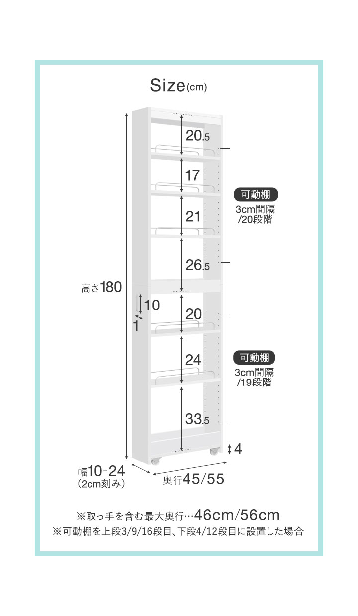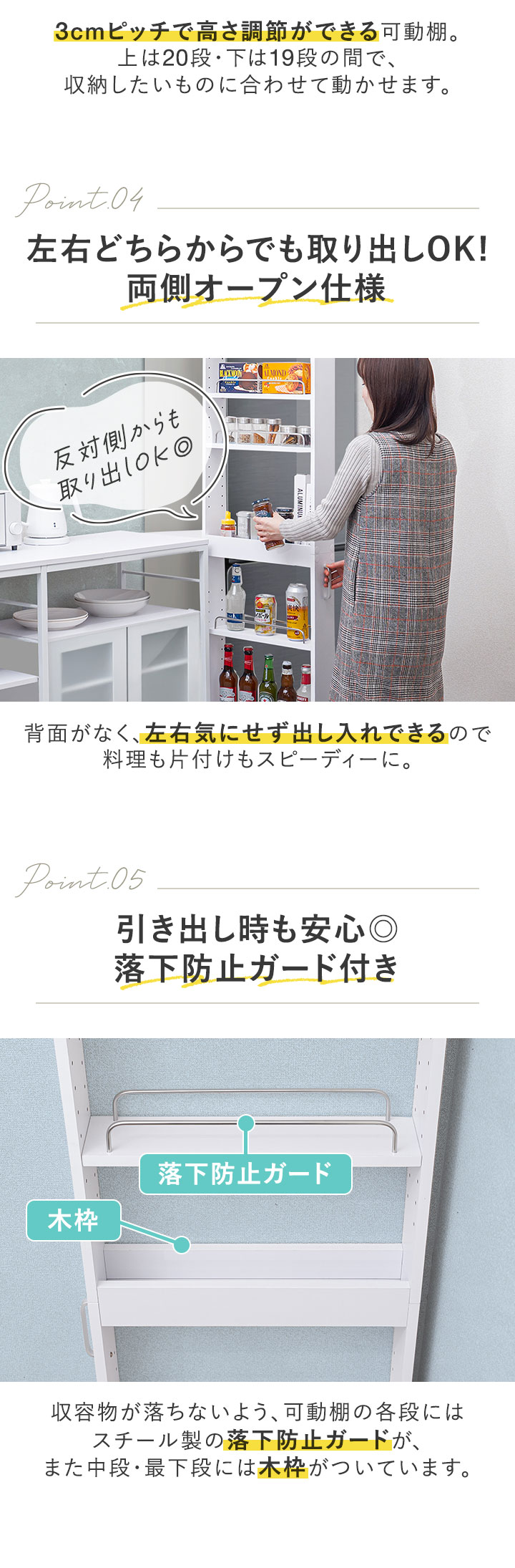3cmピッチで高さ調整ができる可動棚。上は20段・下は19段の間で、収納したいものに合わせて動かせます。