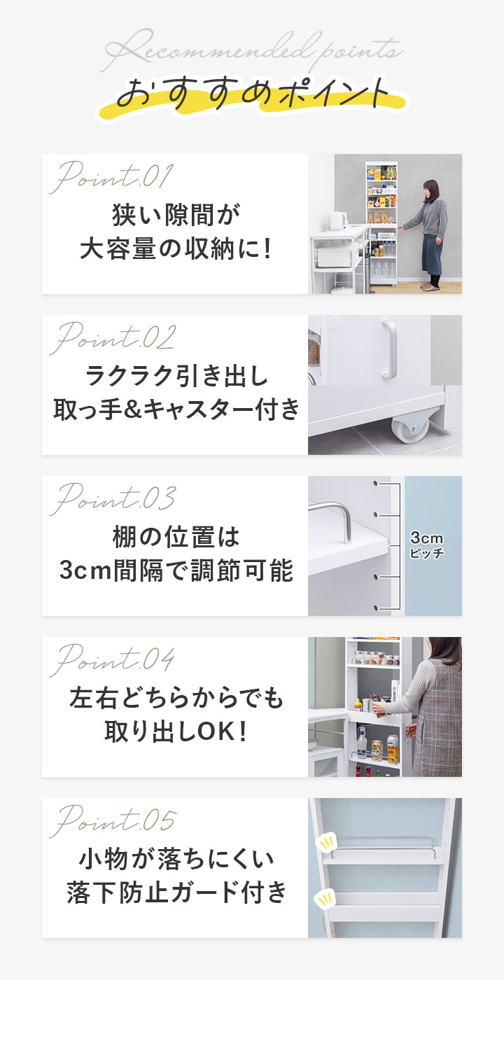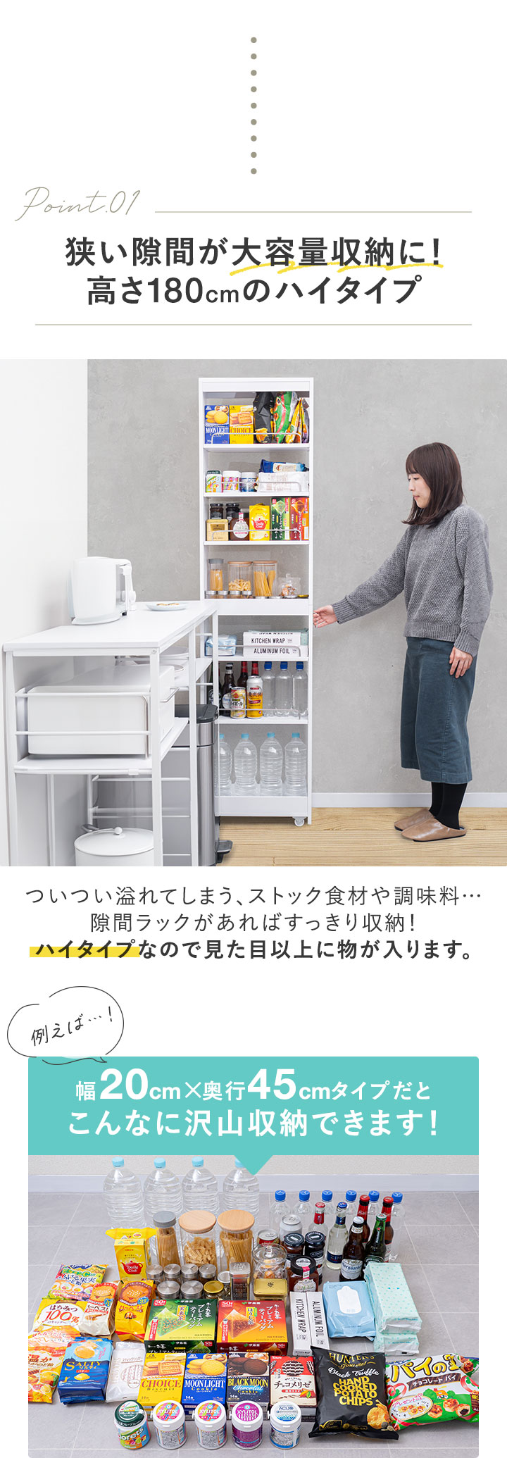 ついつい溢れがちな食材や調味料…隙間ラックがあればすっきり収納!ハイタイプで見た目以上に物が入る!