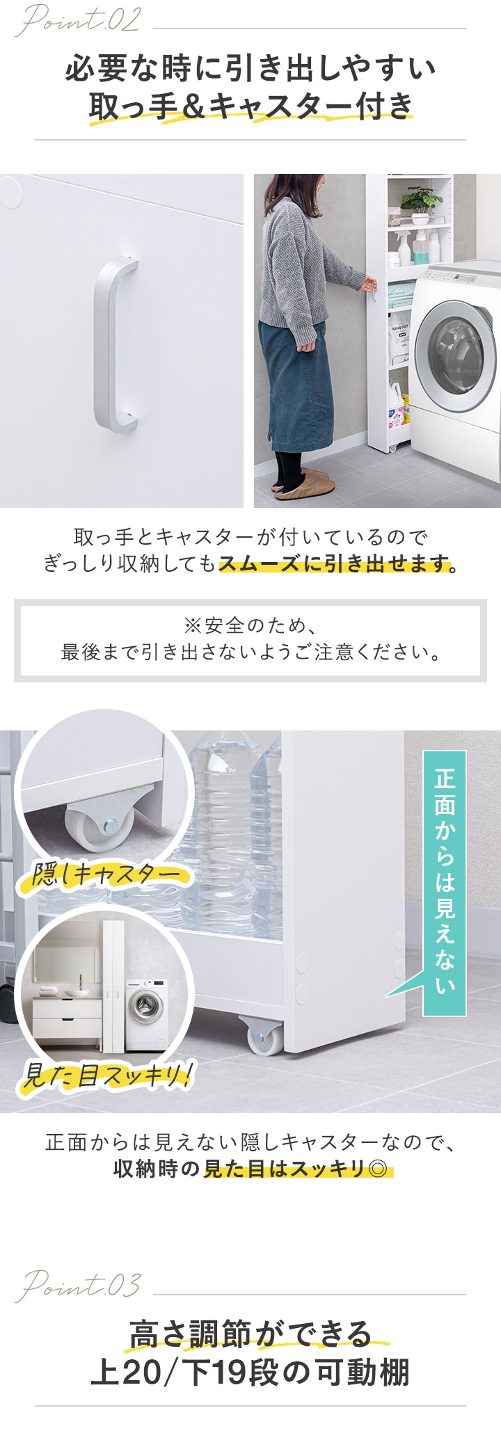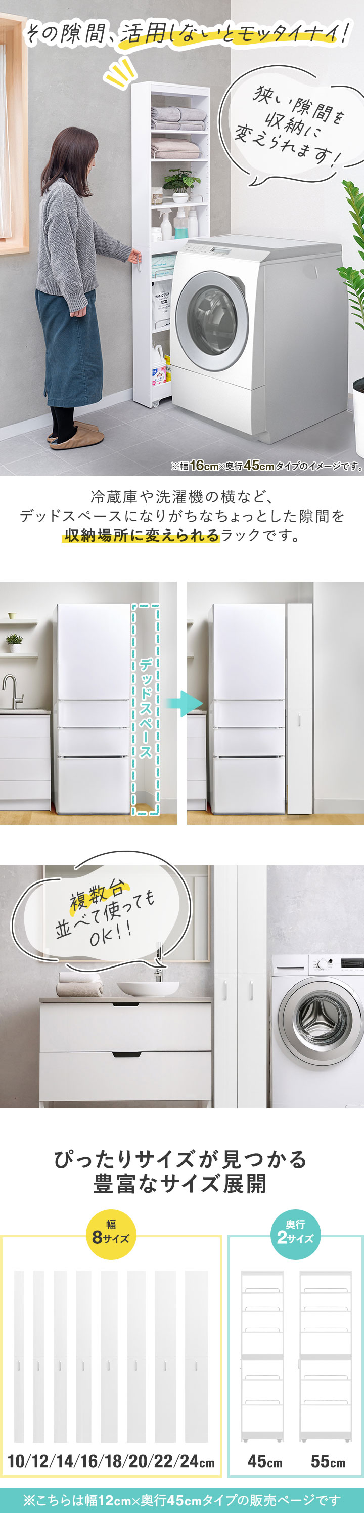 冷蔵庫や洗濯機の横など、デッドスペースになりがちなちょっとした隙間を収納場所に変えられるラック。