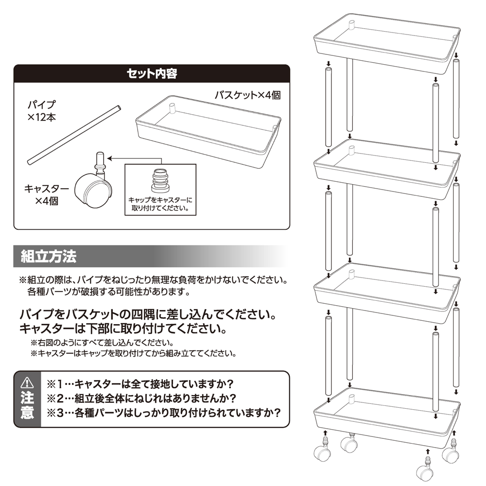 セット内容 パイプ×12本、バスケット×4個、キャスター×4個