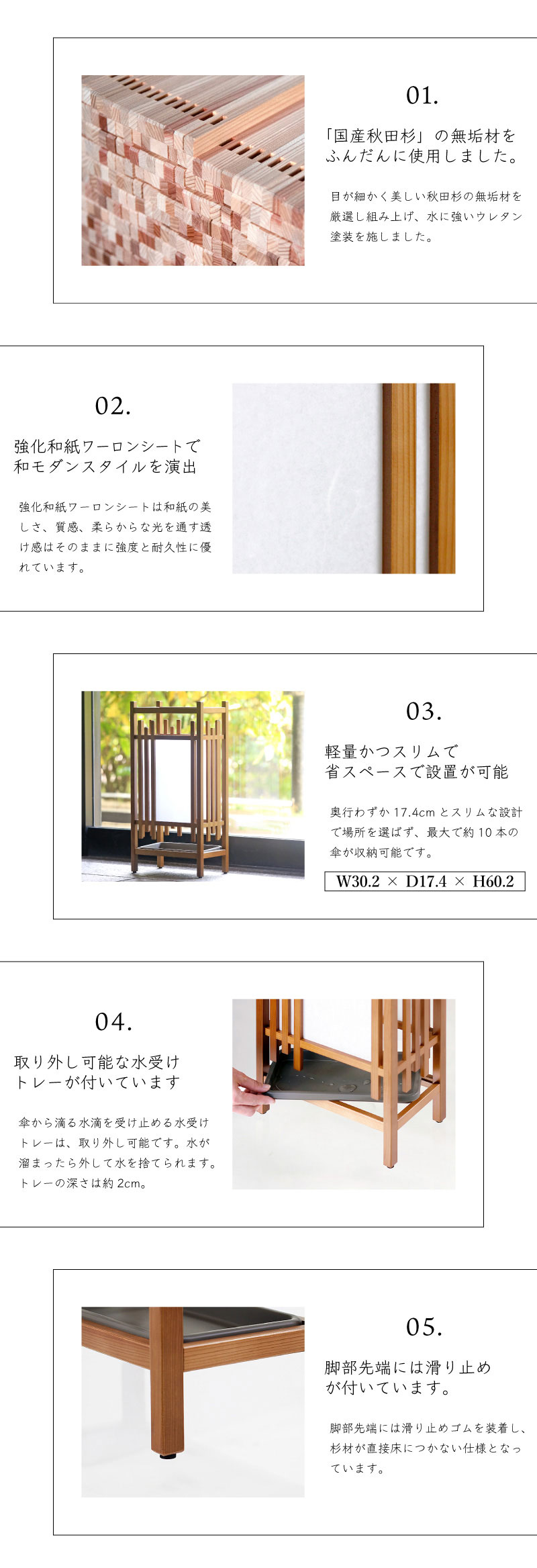 和の気品漂う傘立て。日本の職人が伝統技術を駆使し組み上げたフレームに強化和紙(ワーロンシート)を合わて和のテイストを表現。 軽量且つコンパクトサイズ設定なので玄関の限られたスペースでも設置が可能。素材にもこだわり、 国産の秋田杉をふんだんに使用し、木の温もり感じる逸品です。