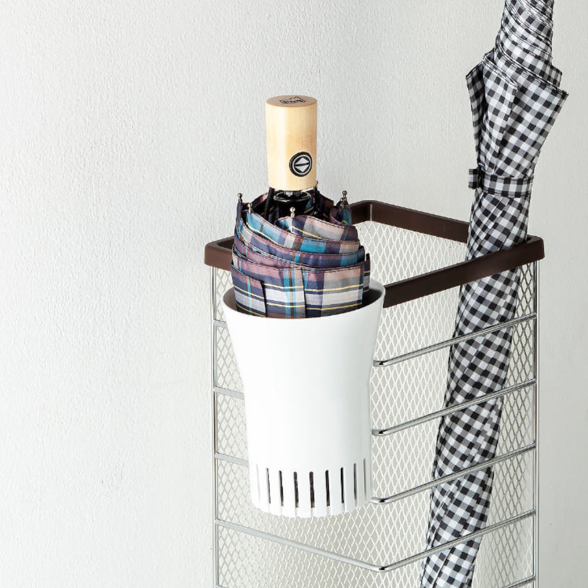 ●丸型の傘立てにもスッキリ収まります。