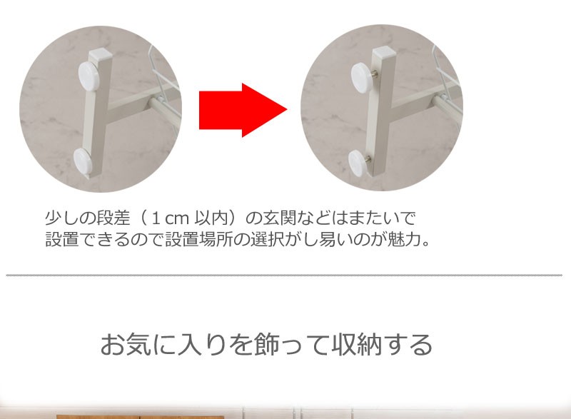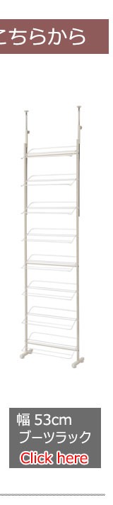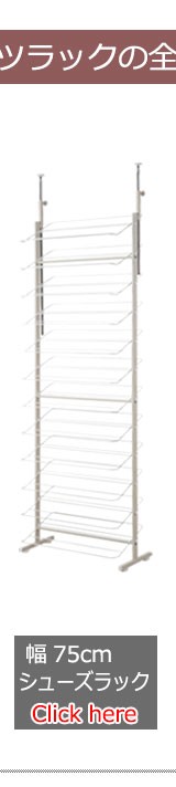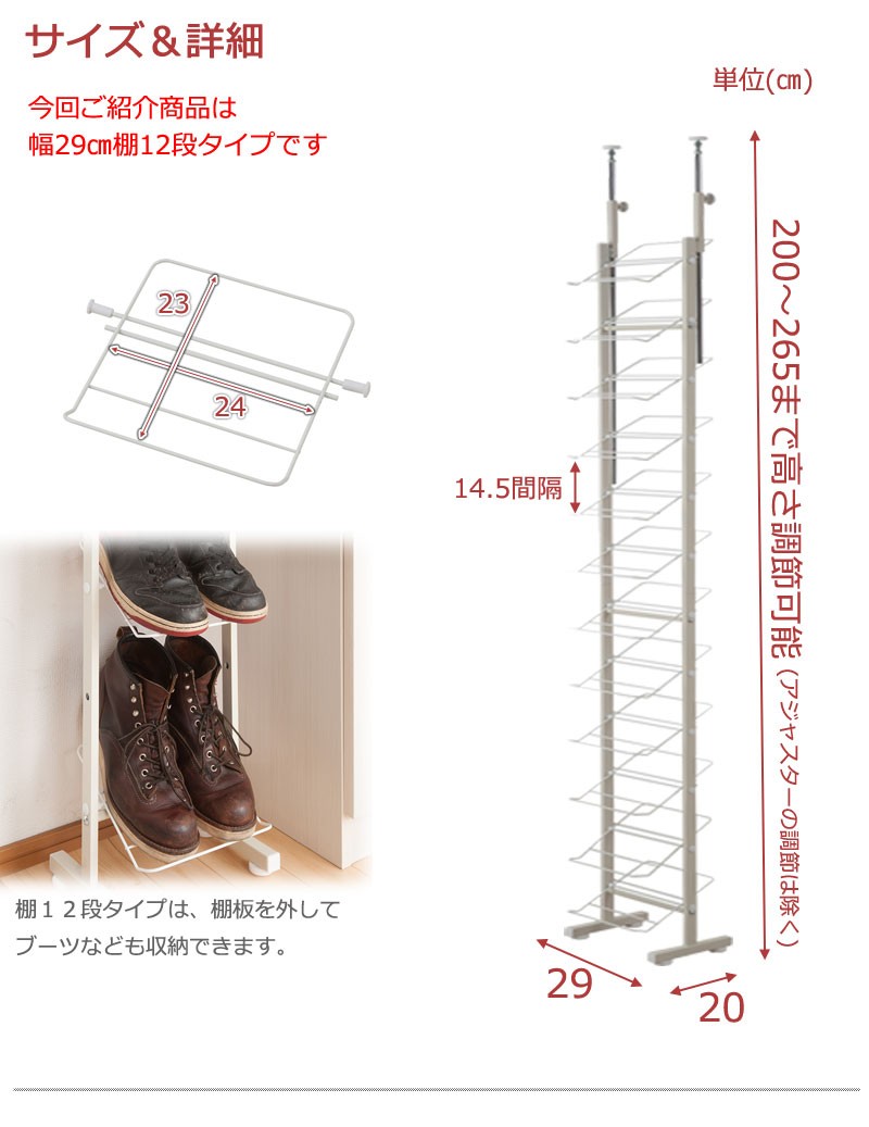 ■商品について/玄関に溢れている靴をしっかり、且つ大量収納でき、玄関のデッドスペースを有効活用できるシューズラックが登場!お気に入りの靴をおしゃれに飾ることで、毎日のお出かけが楽しくなること間違いなし!奥行が22.5cmと省スペース設計でデッドスペースに最適!更に12段あるので収納もしっかり!棚を斜めにすることで奥行をとらず、靴を取り出しやすく、見やすくおしゃれに収納できます。また、ワイヤー式なので靴べらや傘などをかけることができ、とても便利。低めの玄関框をまたいだ状態でも設置できるように微調整可能なアジャスターがついており、更に突っ張り式で安心。安全の日本製。幅29cm・53cm・75cm、幅29cmハイカット・幅53cmハイカットの5種類。玄関だけでなくお部屋にインテリアとしてもディスプレイ感覚でショップ風にキメる!