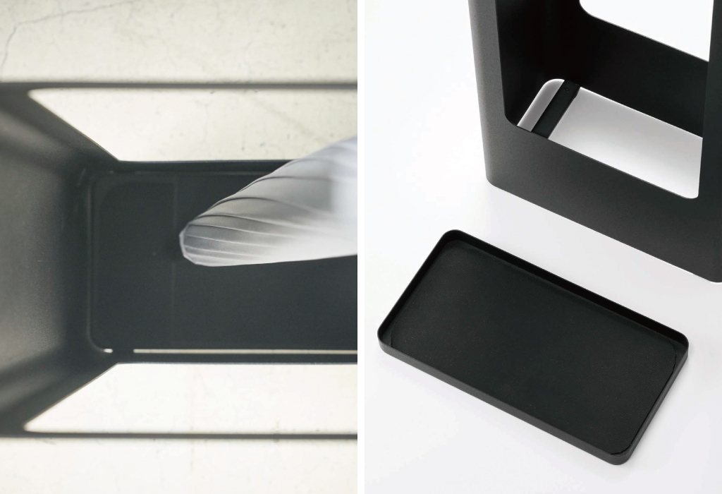 底面の水受けトレーで傘に付いた水分をしっかり受け止めます。トレーは取り外せるので溜まった水の排水も簡単です。トレー内部にはシリコーン製のマットが付いています。収納した傘が滑らず、傘の先端の傷も防いでくれます。