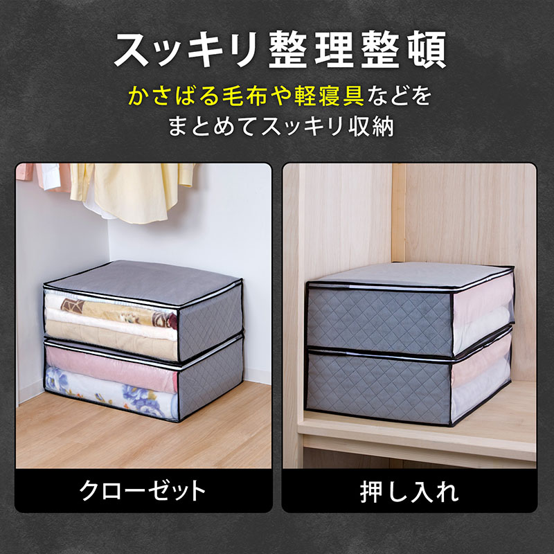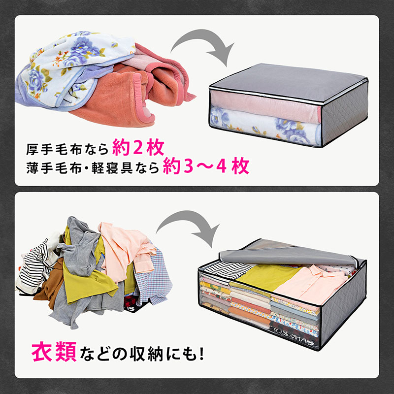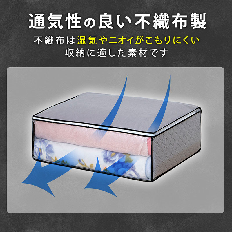 ●活性炭のチカラで消臭保管。活性炭シートがにおいをしっかり消臭。静電気が発生しやすくホコリが付着しがちな毛布や軽寝具などをにおい・ホコリ・汚れからしっかり守る。