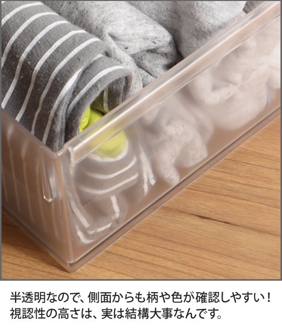半透明の樹脂製なので、似たような色の服があっても、側面から見える柄などで判別しやすくなる点も便利でした!