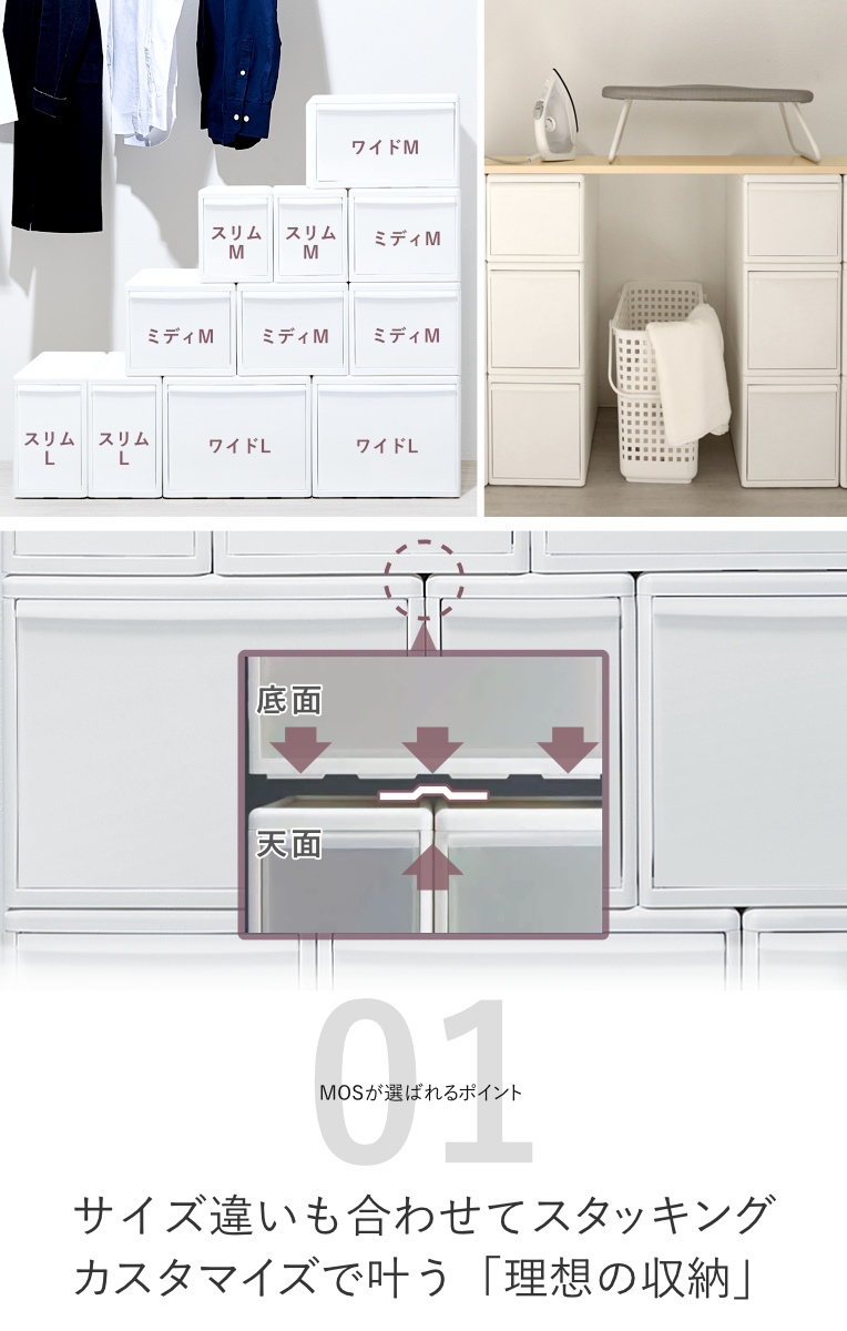 3種類の幅の異なる収納ケースでも積み重ねができるスタッキング構造で、自由にカスタマイズができます。無駄な空間を作らないブロック式構造なので、スッキリとした見た目です。MOSの収納ケースなら、スペースを有効活用したあなただけの「理想の収納」が作れます。