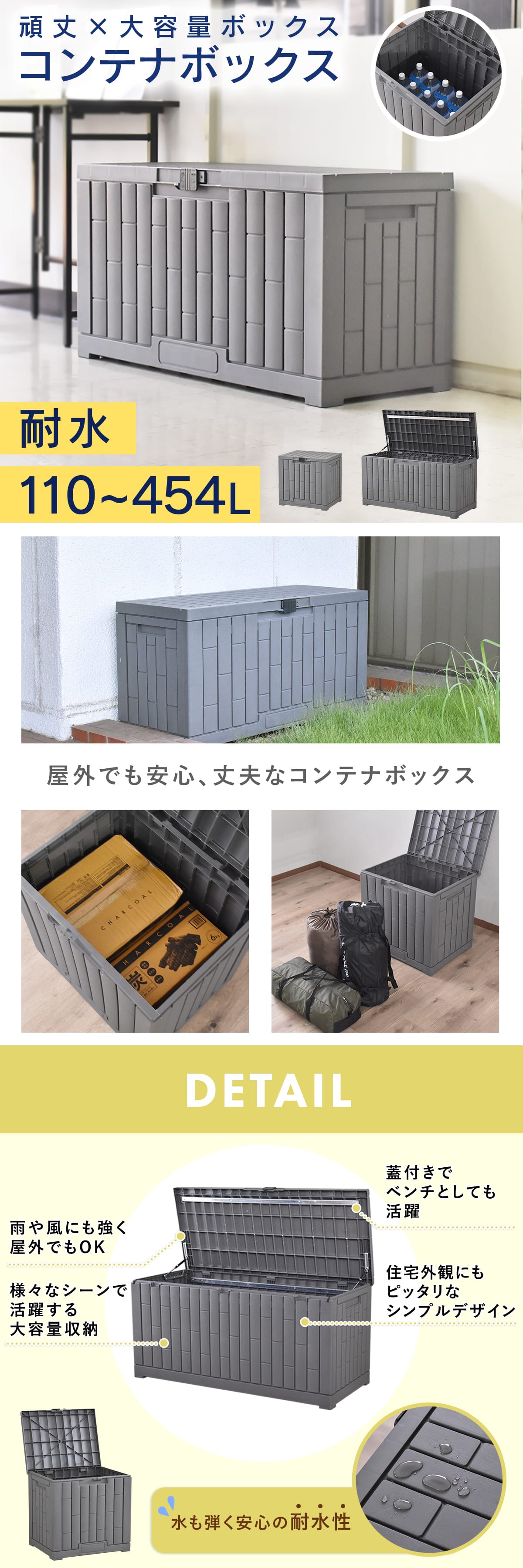 雨やほこりから収納物を守る蓋付き設計に加え、耐水加工で水をしっかりはじく仕様なので、屋外でも安心して使用できます。蓋は開閉がスムーズで、重い荷物を入れるときや取り出すときも簡単。ゴミ収集ボックスやアウトドア用品、家庭菜園の道具など、屋外で使用する物の保護に最適です。雨水や埃の侵入を防ぐため、収納物が濡れたり汚れたりする心配がありません。日常の使い勝手を重視した設計で、ベランダや庭先、ガレージなどあらゆる屋外環境に対応。蓋付きかつ耐水仕様の安心感は、収納物の長期保存や整理整頓において大きなメリットとなります。