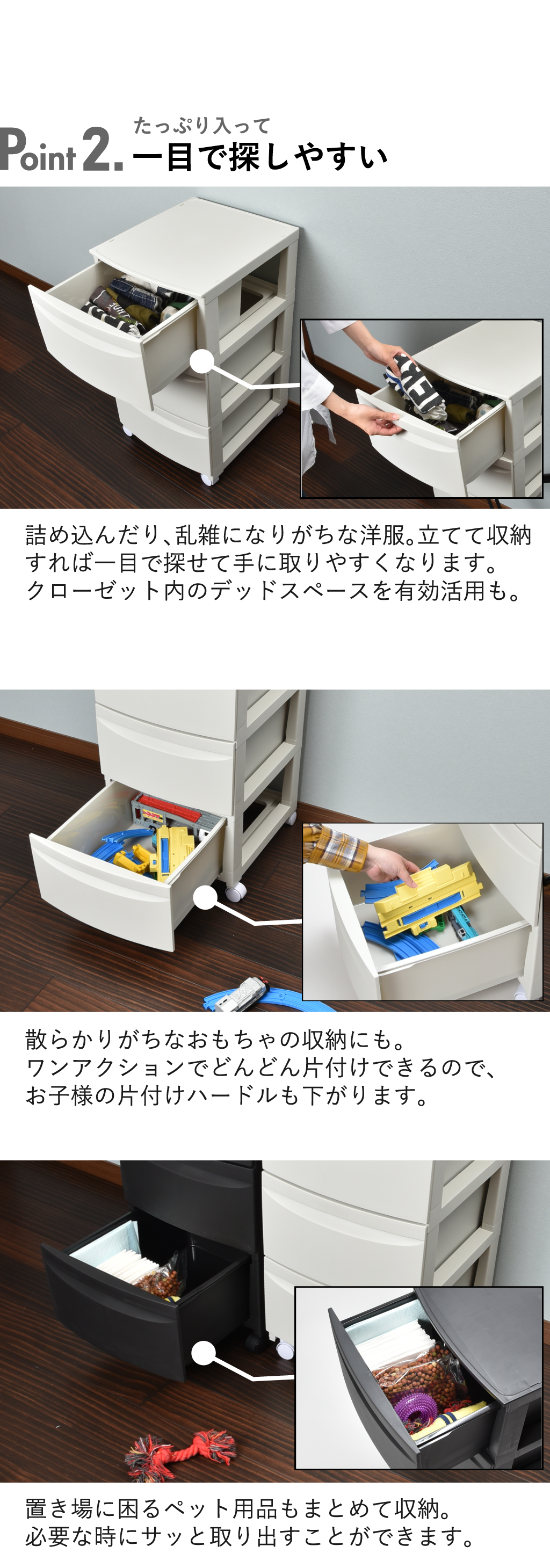 引き出しの中身が見えないので、生活感の出てしまうものや、下着などの隠したいものも気にせずに収納ボックスに入れることができます。