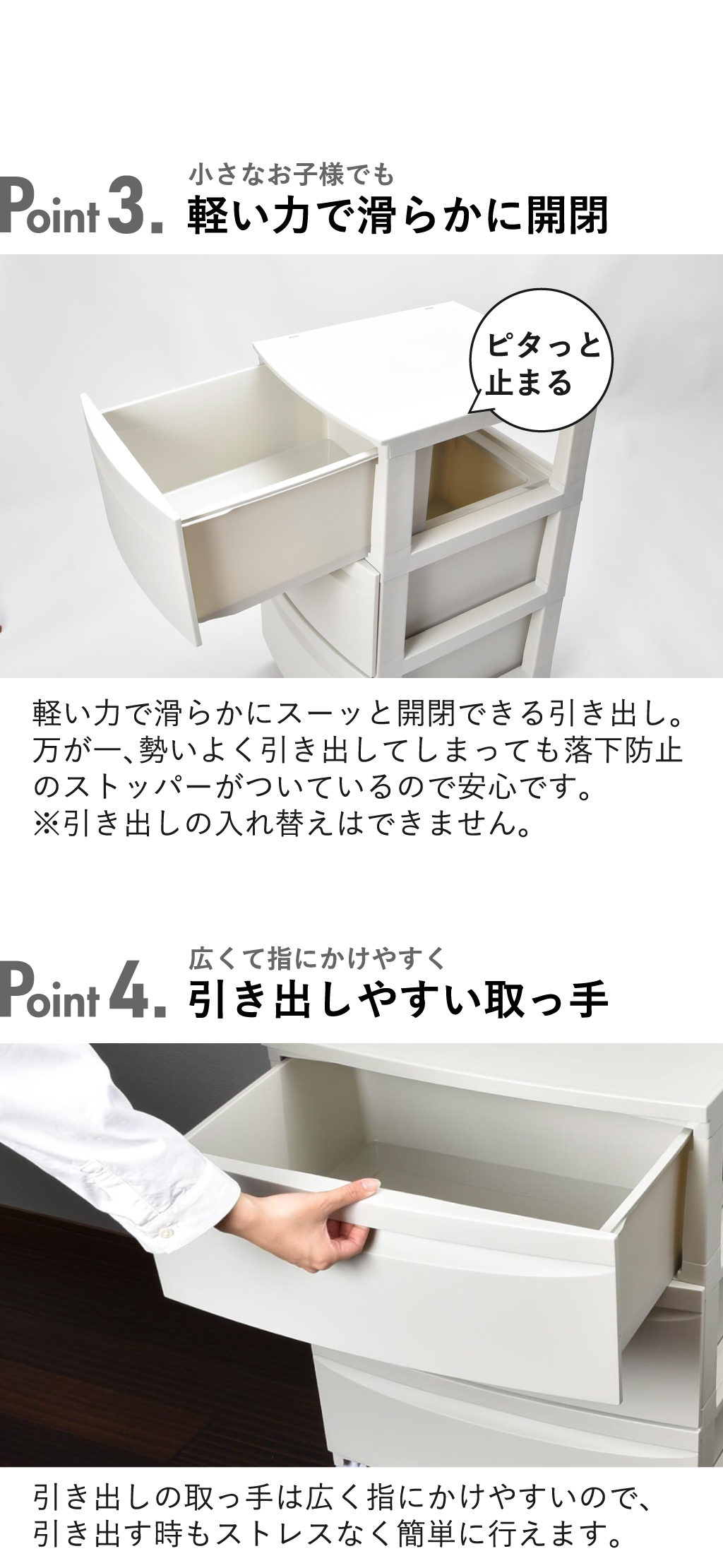 広くて指にかけやすい取っ手付きの引き出しには、ストッパーが付いているので、
