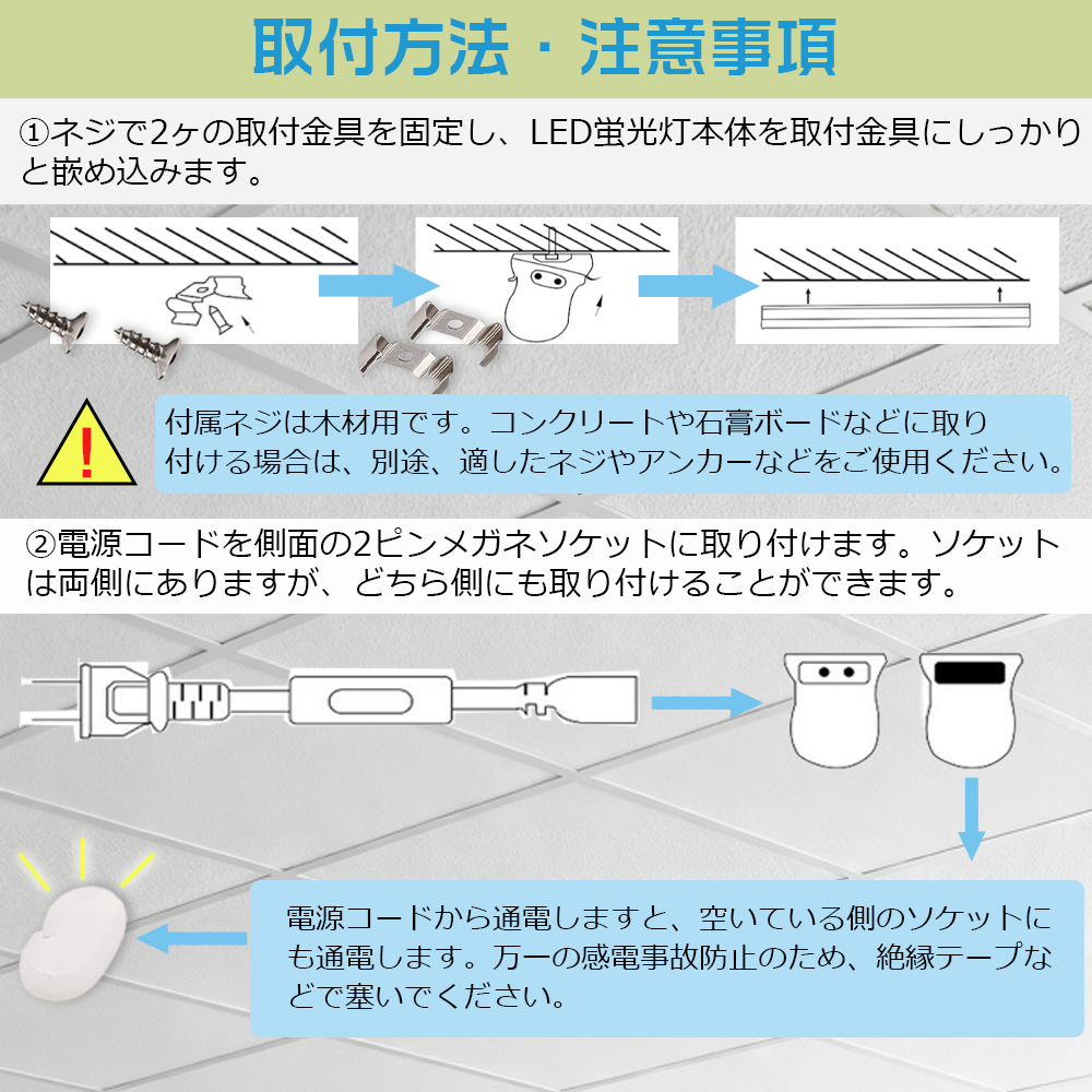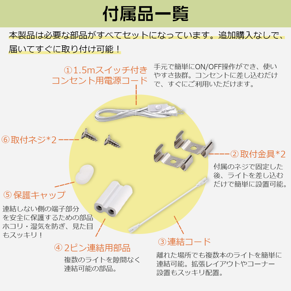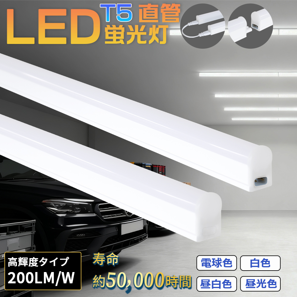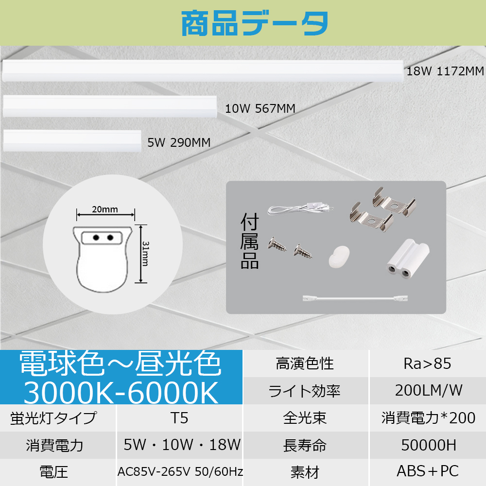 器具一体型のLED蛍光灯T5タイプです。別途器具を用意する必要がなく、届いてすぐにご使用いただけます。両端に電源ケーブルを差し込むソケットを搭載しており、どちら側からでも給電が可能です。連結用ケーブルや直結プラグを使用することで、複数本を直列または並列に簡単に連結できます(最大15本まで対応)。スリムなデザインながら高い明るさを実現し、省スペース設置にも最適なLEDライトです。