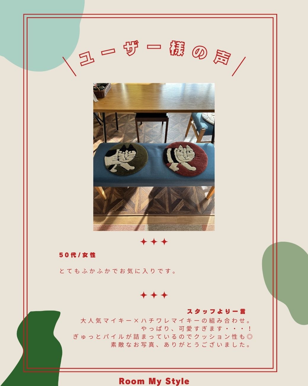 ハンドフックの特徴【ハンドメイドならではの個体差】・一つ一つ手作りのため、サイズや柄の出方に多少の違いがあります。・色味に若干の濃淡や糸の太さの差が生じることもあります。【遊び毛について】・フック織りの特性上、使用初期に遊び毛が出やすいため、週1〜2回程度を目安に掃除機や粘着クリーナーでお手入れしてください。・強い吸引や毎日の掃除機がけは、糸のほつれや摩耗の原因となるため、かけすぎにはご注意ください。